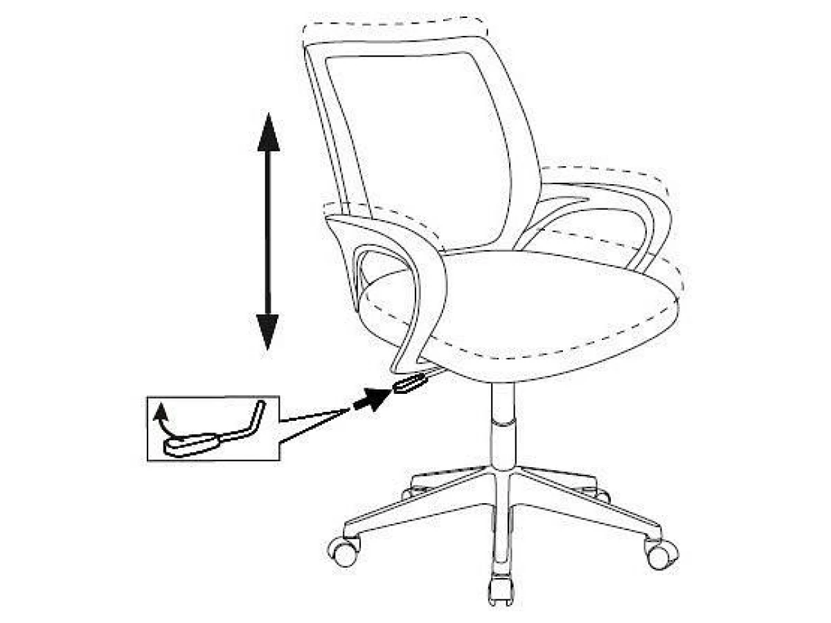 Регулировка высоты (газлифт). Белая пластиковая крестовина. Подлокотники белые пластиковые. Соответствует стандарту BIFMA.