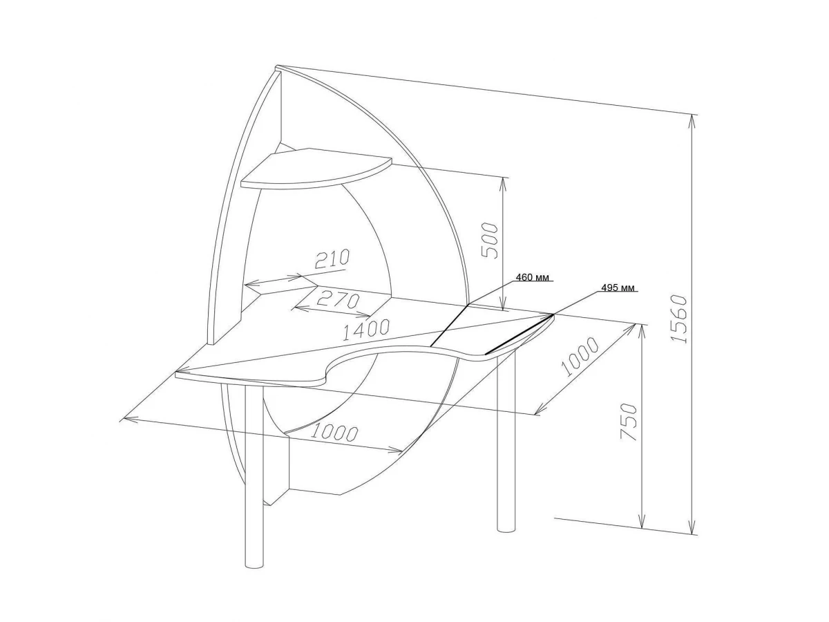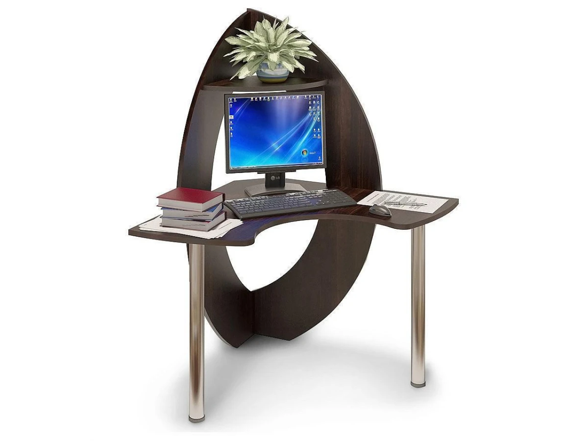 Стильный угловой стол премиум класса. Эргономичная столешница обеспечивает удобное и комфортное размещение за столом, так как изгиб столешницы повторяет положение рук при работе. Металлические опоры придают столу легкий и современный вид. Столешница и стойка изготовлены из высококачественного ламинированного ДСП российского производства толщиной 22 мм., полочка в верхней части стойки - 16 мм. Торцы деталей обработаны ударопрочной кромкой ПВХ 2 мм. Этот стол, яркий представитель авангардного направления, сделает ваше рабочее место изысканным и неповторимым. Проем под монитор - 500х425 мм. (под монитор 19”).