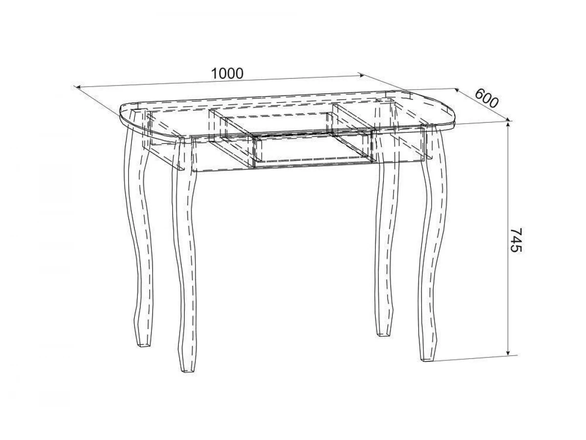 1000 мм в длину, 600 мм в ширину и 745 мм высоту.