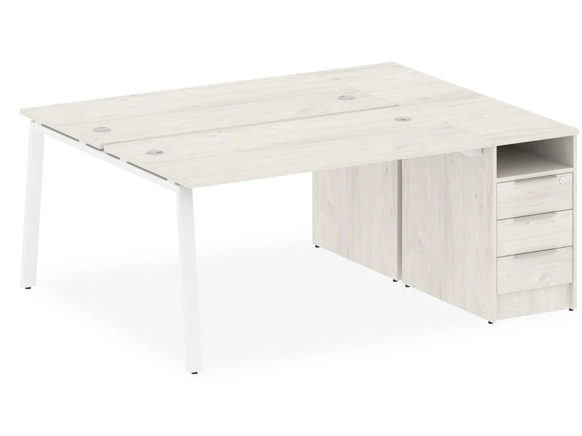 1 полка,3 ящика,, тумбочка:1 полка,3 ящика. Для изготовления корпуса был выбран ЛДСП Е1, металл в оттенке белый, дуб наварра, завершает дизайн матовый верхний слой, гармонично перекликающийся со столешницей. Приобрести данную модель вы можете по привлекательной цене, равной 43937 руб.