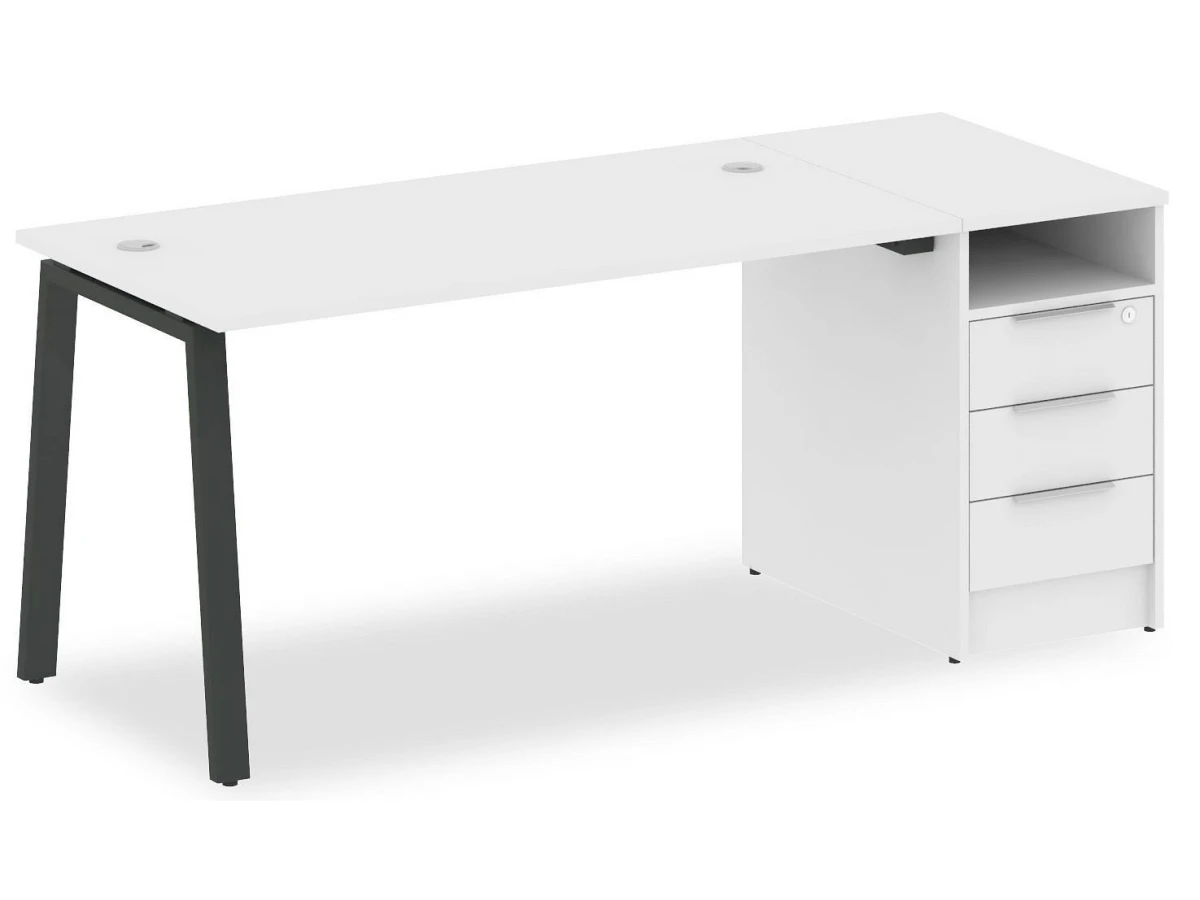 1 полка,3 ящика. Для изготовления корпуса был выбран ЛДСП Е1, металл в оттенке антрацит, белый, завершает дизайн матовый верхний слой, гармонично перекликающийся со столешницей. Купить данную модель вы можете по привлекательной цене, равной 23025 руб.