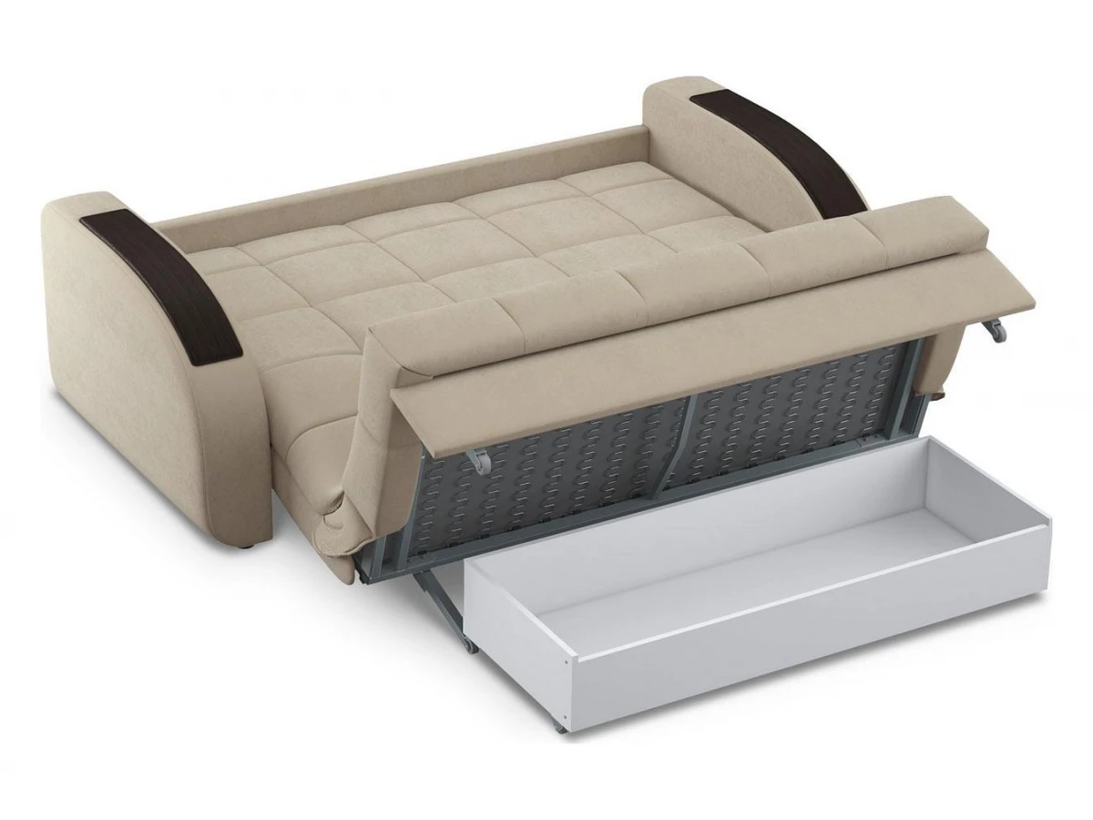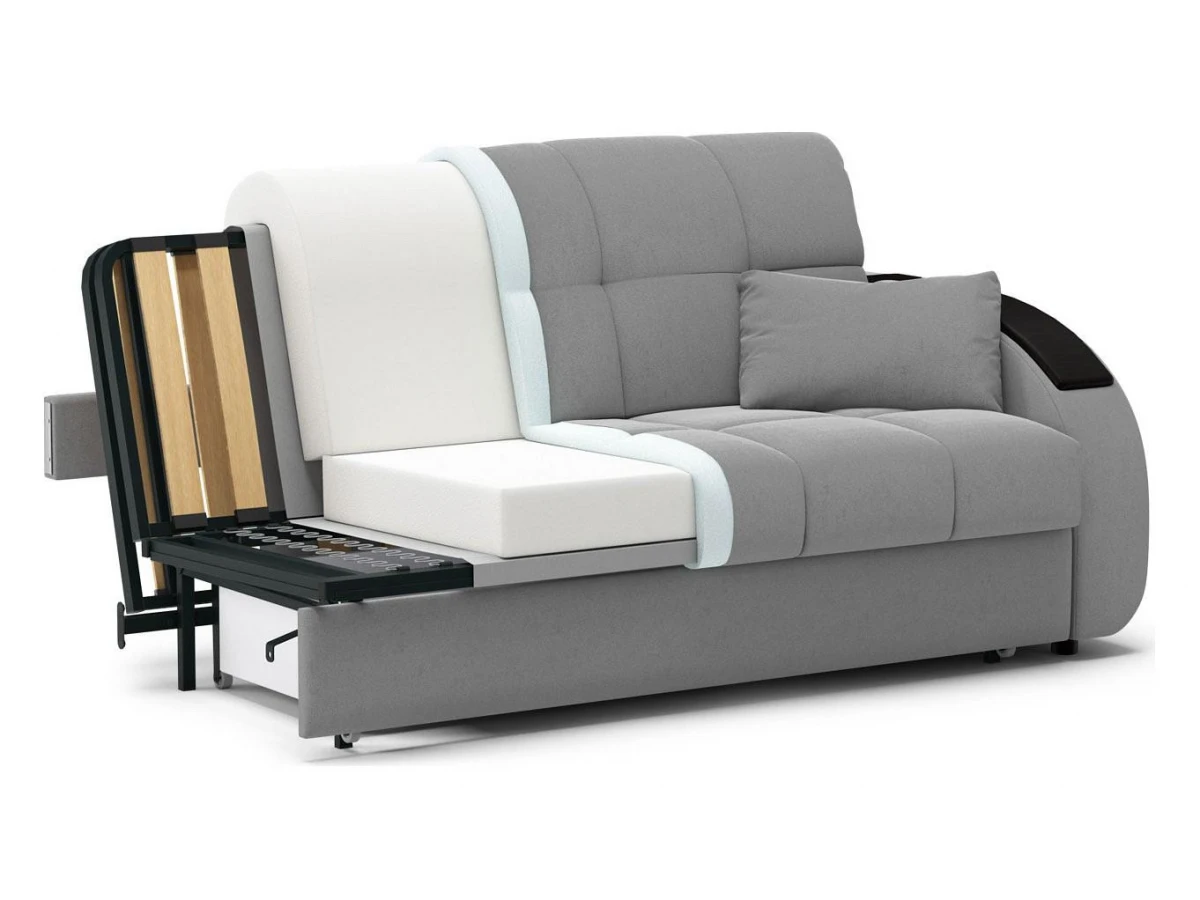 комфортный уровень посадкисовременный модный дизайннадежный механизм трансформации подходит для ежедневного использованиядиван обладает полноценным спальным местоморигинальный декор подлокотников выполняет функцию практичных столешницчехол модели съемный для чистки.