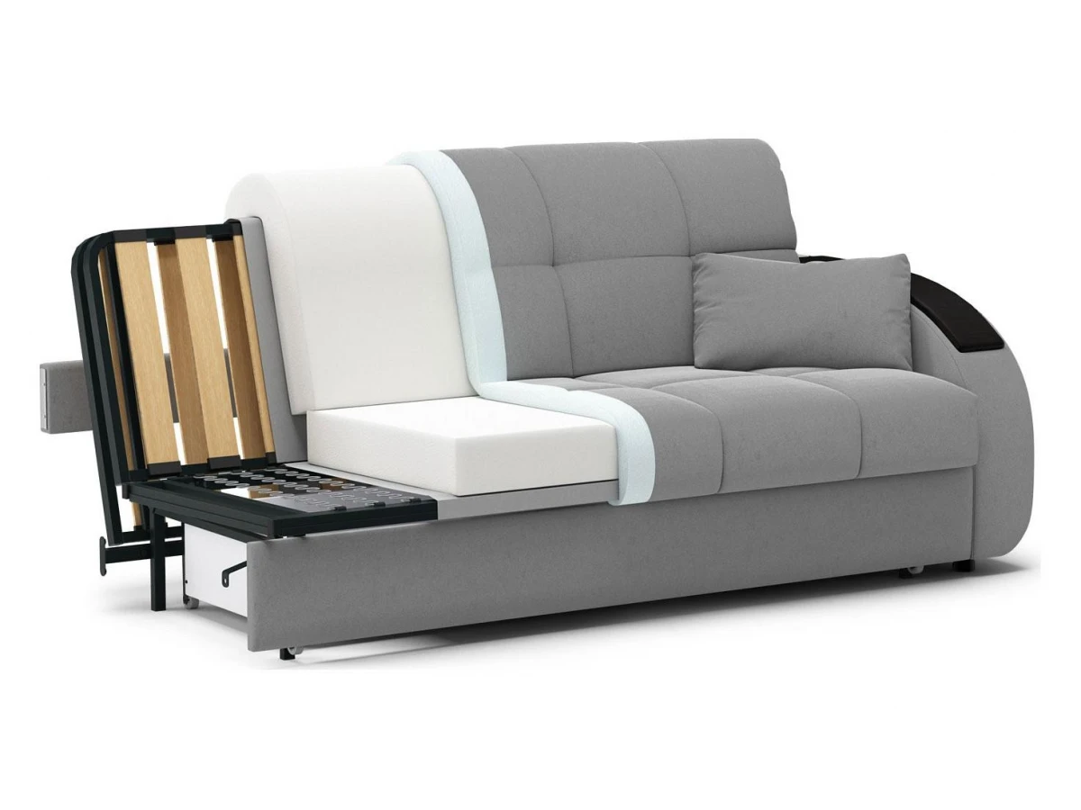 комфортный уровень посадкисовременный модный дизайннадежный механизм трансформации подходит для ежедневного использованиядиван обладает полноценным спальным местоморигинальный декор подлокотников выполняет функцию практичных столешницчехол модели съемный для чистки.