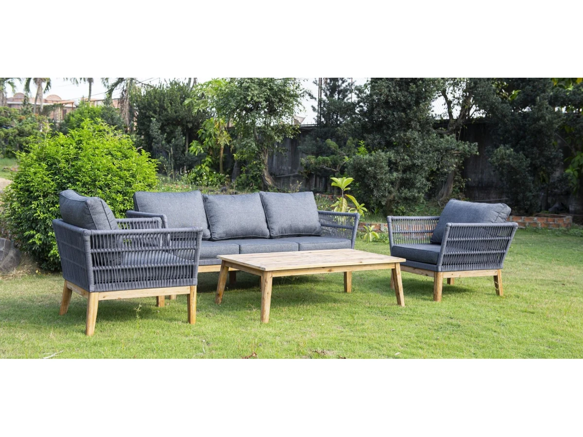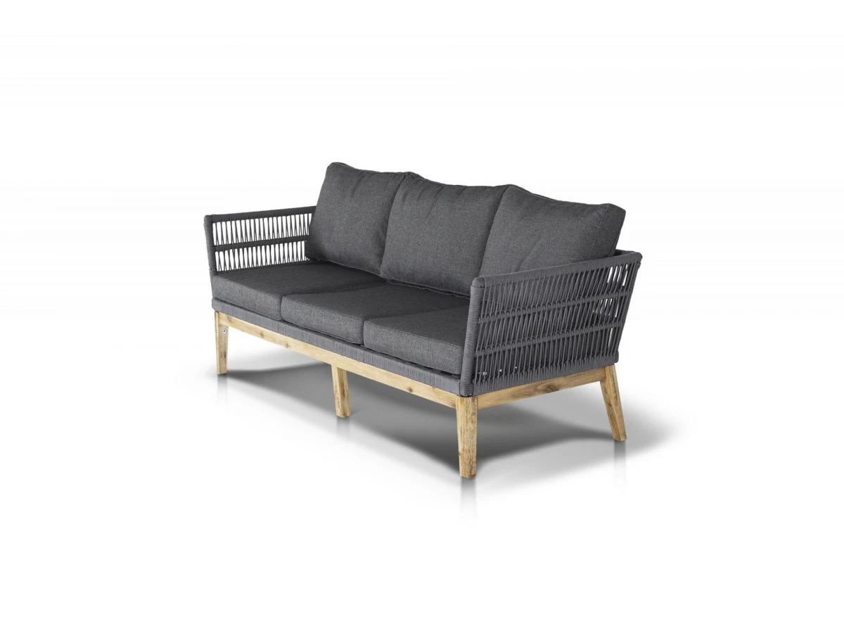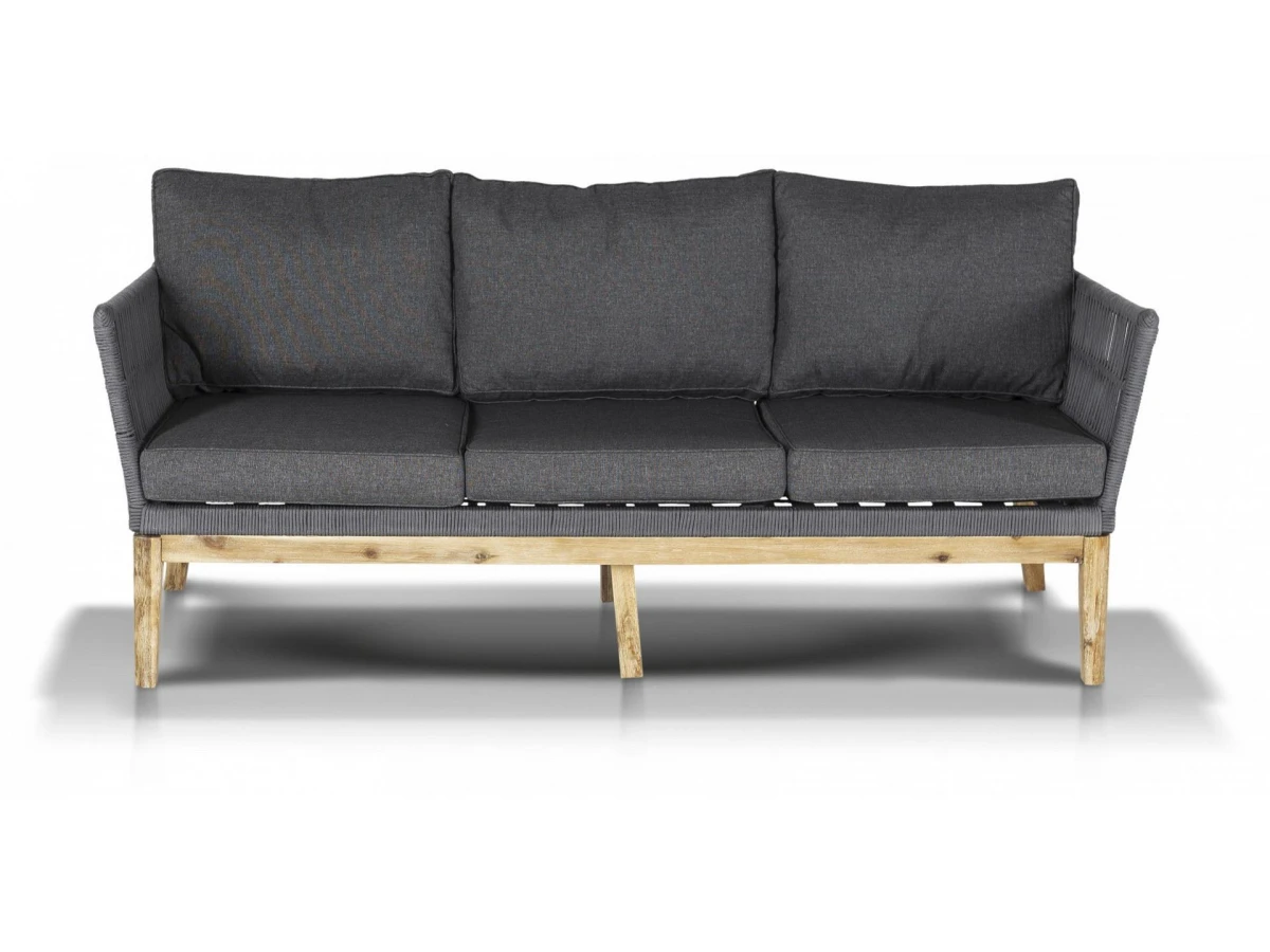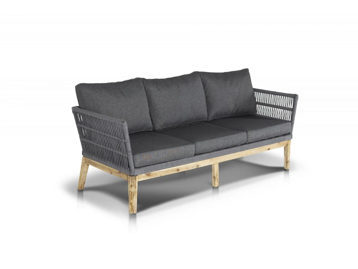 Диван Мальорка предназначен для одновременного размещения трех персон. В его основе находится деревянный каркас из акации натурального цвета. Оплетен вручную эластичными синтетическими лентами из высокопрочного полиэфирного волокна.