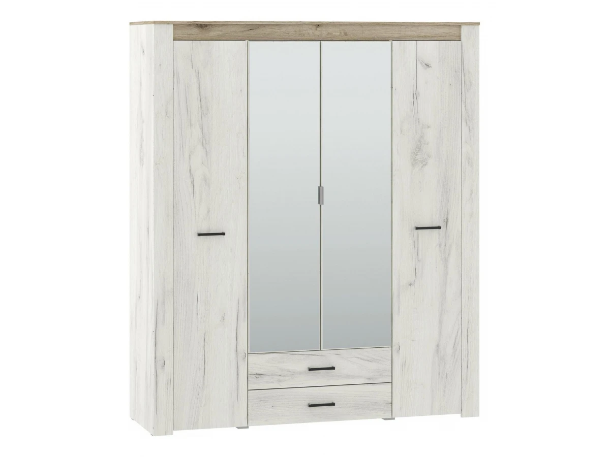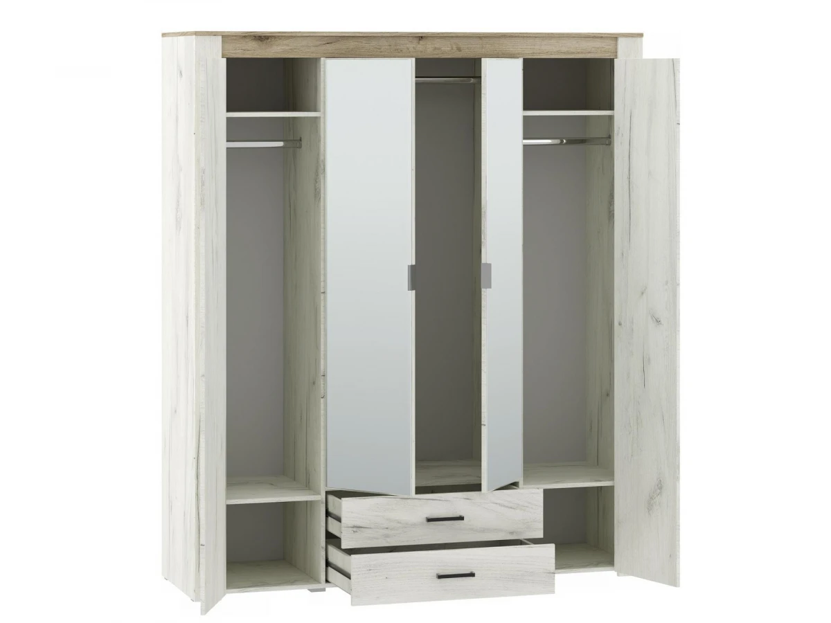 Ищете долговечную и эффектную мебель для дома? Шкаф платяной Прага из коллекции «Прага» – то, что вам нужно. в следующей комплектации: 2 ящика, 3 штанги для вешалок, 4 дверцы, 4 полки. Зеркало, ЛДСП Е1, из которого сделан фасад, имеет качественное верхнее покрытие (оттенок «дуб белый крафт, зеркальный»), подходящее для размещения в зонах с повышенной проходимостью, а комфортные габариты изделия позволят сэкономить полезное пространство (шкаф шириной 1740 мм и глубиной 560 мм, при этом вы сможете разместить в нем все необходимое благодаря внушительной высоте, равной 2060 мм).