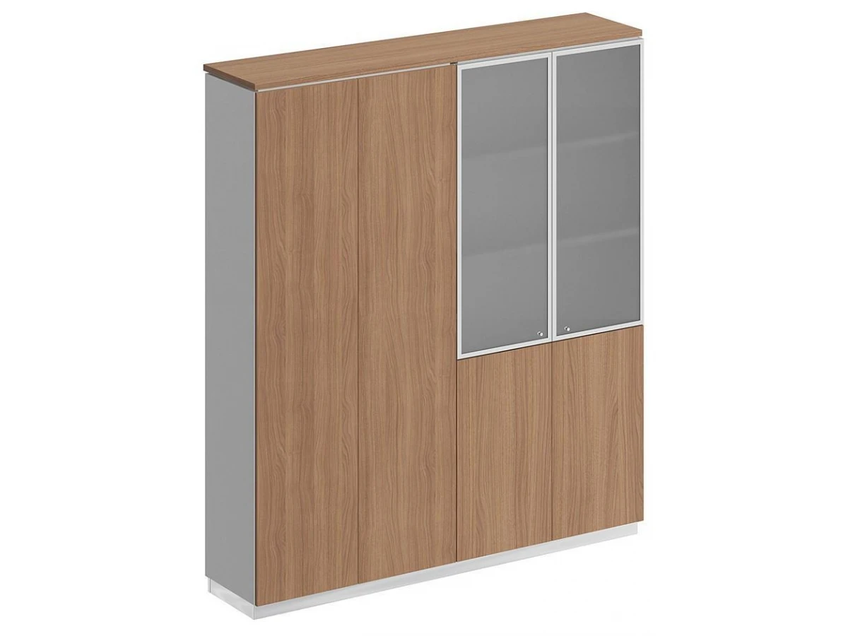 Шкаф состоит из шкафа для документов со стеклом и закрытого шкафа для документов под общим топом, цоколя и дверей.