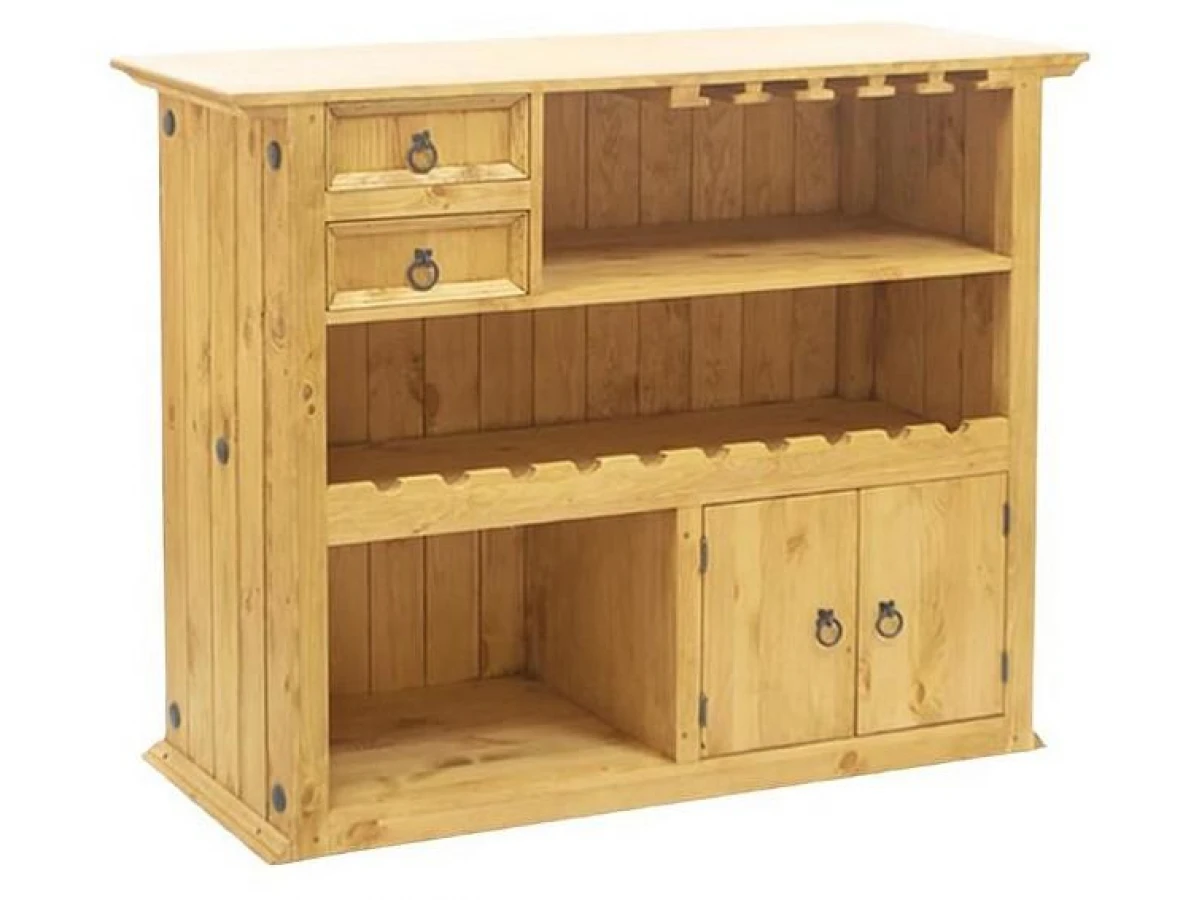 Оригинальное и просто незаменимое приобретение для загородного дома или квартиры. Настоящий деревянный бар разместит бутылки, сверху можно повесить бокалы. Два малых ящика и небольшой шкаф с дверцами пригодятся для хранения мелочей, салфеток, прочих аксессуаров. Модель отлично сочетается с классической мебелью и гармонирует с интерьерами в стиле прованс.