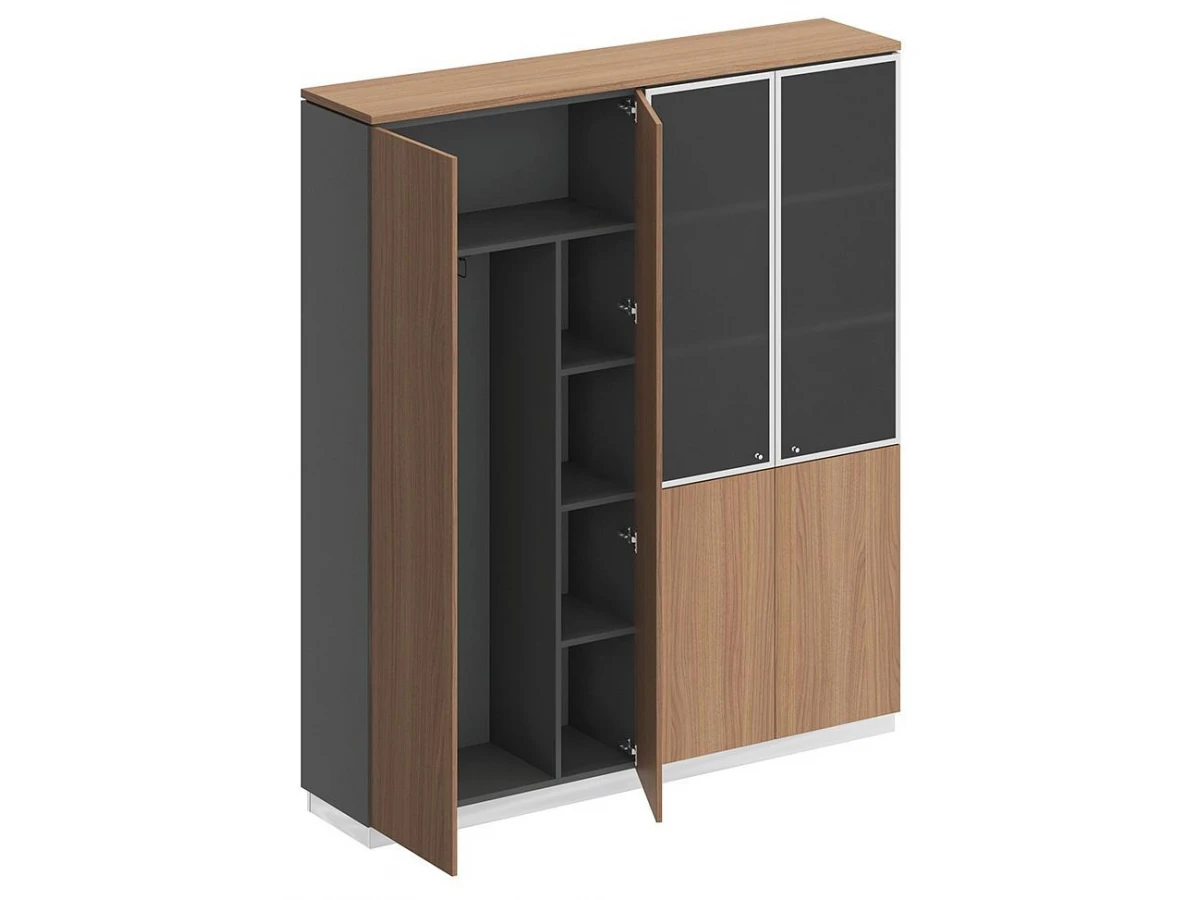 Шкаф состоит из шкафа для документов со стеклом и шкафа для одежды с дополнением под общим топом, цоколя на 2 шкафа и дверей.