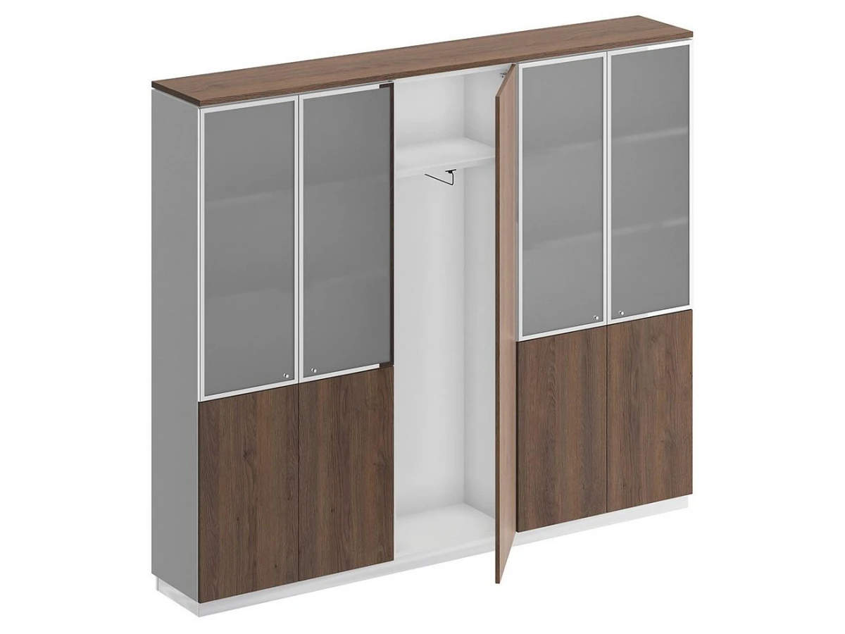 Шкаф состоит из 2-х стеллажей с полками и шкафа для одежды с полками, топа, цоколя и дверей.