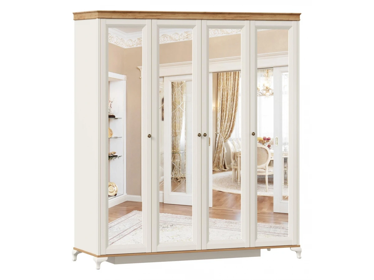 За 4-мя распашными зеркальными дверями 3 отделения – справа и слева одностворчатые отделения ширина 436 мм, в центре двухстворчатое отделение шириной 872 мм.Справа и слева по 4 полки. Расстояние между полками 360 мм.В центре 1 полка и штанга. Ниша вверху высотой 296 мм. Высота ниши со штангой 1582 мм.Максимальная нагрузка на полку - 15 кг.Ручки в комплекте к корпусу.Корпус шкафа комплектуется пилястрами и карнизом.Шкаф установлен на опоры ППУ и потайной короб-опору.Шкаф рекомендуется крепить к стене с помощью угловой подвески. Подвеска в комплекте.Крепеж для подвески к стене приобретается дополнительно.Размеры шкафа даны с учетом опор, пилястр и карниза.