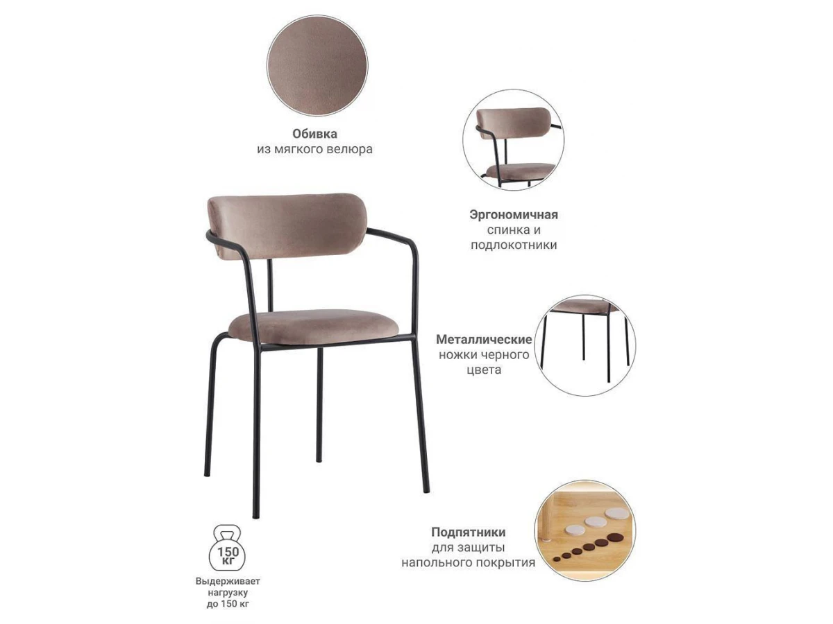 Кресла Ant будут отлично смотреться не только в гостиной, но и станут интересным решением для вашей спальни. Подойдут для кухни, а также для кафе и ресторанов с шикарным дизайном. Цвет обивки нейтрален, поэтому подойдет в качестве дополнения к любому интерьеру. Мягкая, приятная обивка из велюра на сиденье и спинке стула делает его еще более комфортным. Металлическое основание прочное и долговечное, оно способно выдержать вес до 150 кг.