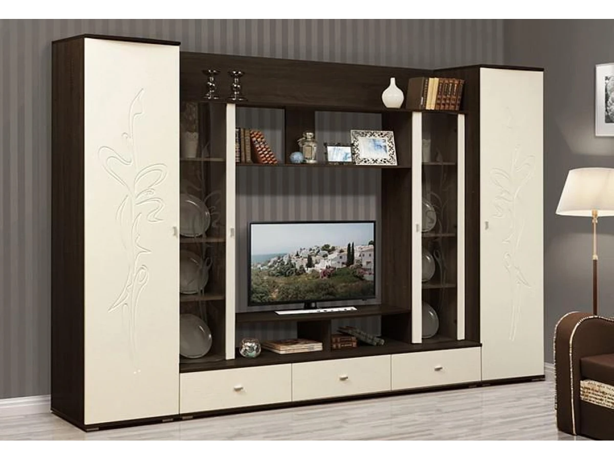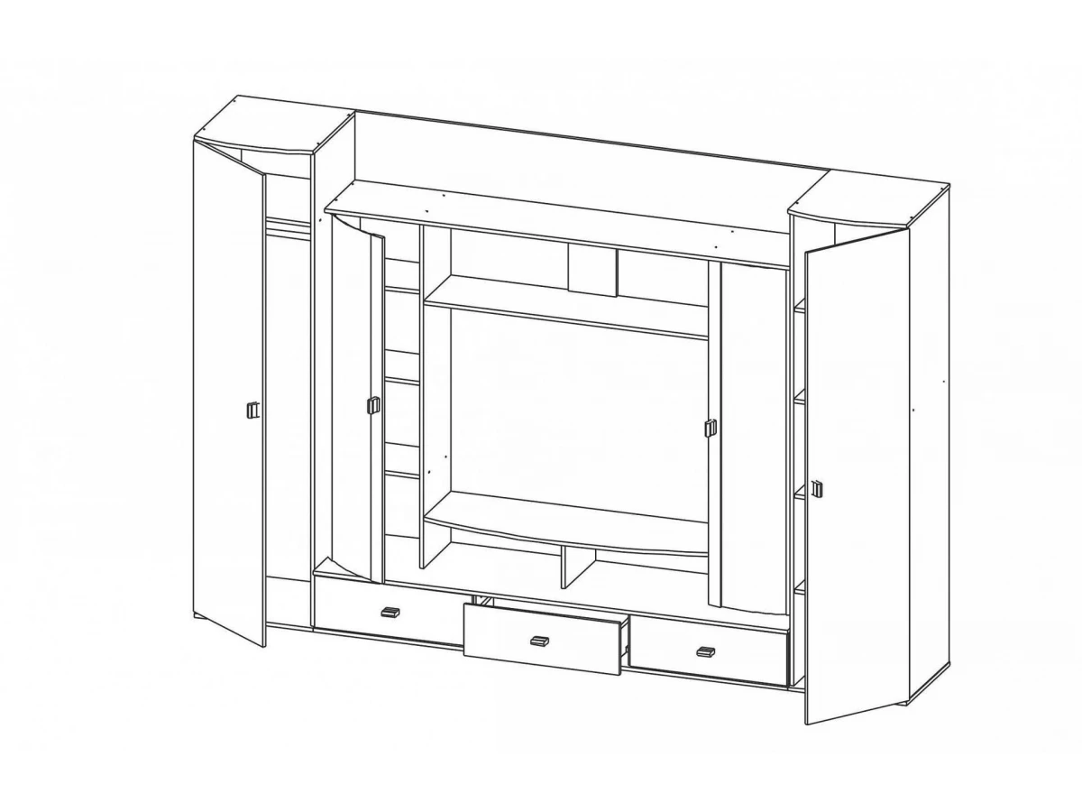 Большая и вместительная стенка Лаванда-1 имеет три выдвижных ящика и четыре отделения, оснащённых распашными дверцами.