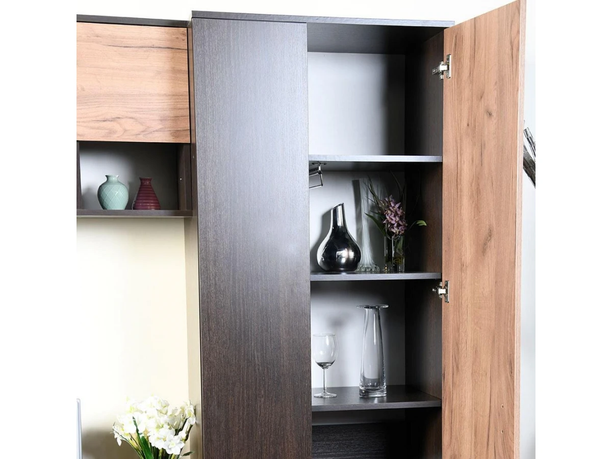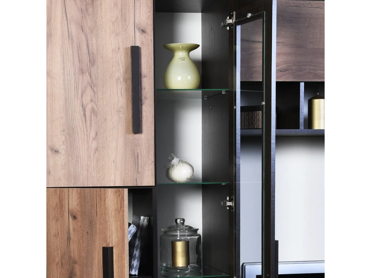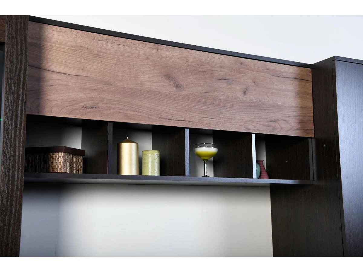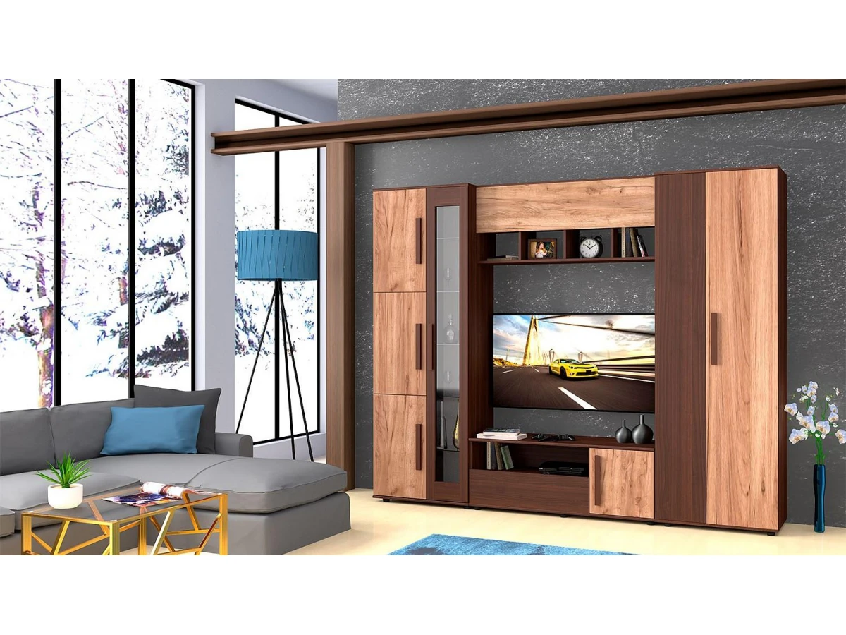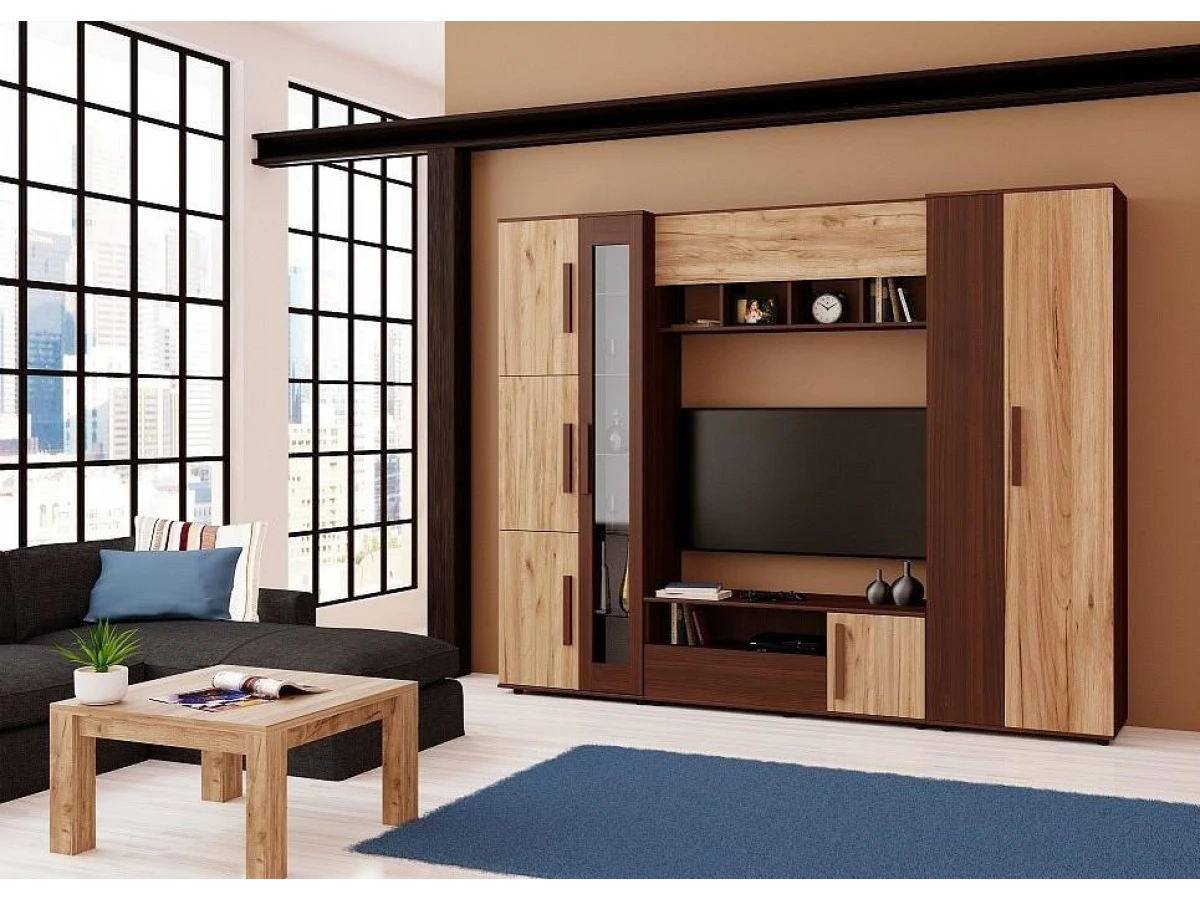 Серия «Крафт», представленная производителем Заречье – это актуальная современная мебель, созданная на высокотехнологичном оборудовании. Стенка для гостиной Крафт ZAR_Kraft_system является ярким представителем этой коллекции. Стенка состоит из следующих компонентов: полка навесная - 1200x308x507 мм тумба под ТВ - 1200x436x459 мм шкаф-витрина - 700x436x2097 мм шкаф платяной - 700x436x2097 мм, и стоит 41581 руб. Запоминающийся дизайн подчеркивается изысканностью оттенка фасада (дуб крафт табачный, орех вирджиния), сделанного из простого в эксплуатации и надежного материала (ЛДСП Е1, стекло), а матовый, прозрачный корпус, выполненный из ЛДСП Е1, стекло, завершает образ. Перед покупкой обратите внимание на размеры.