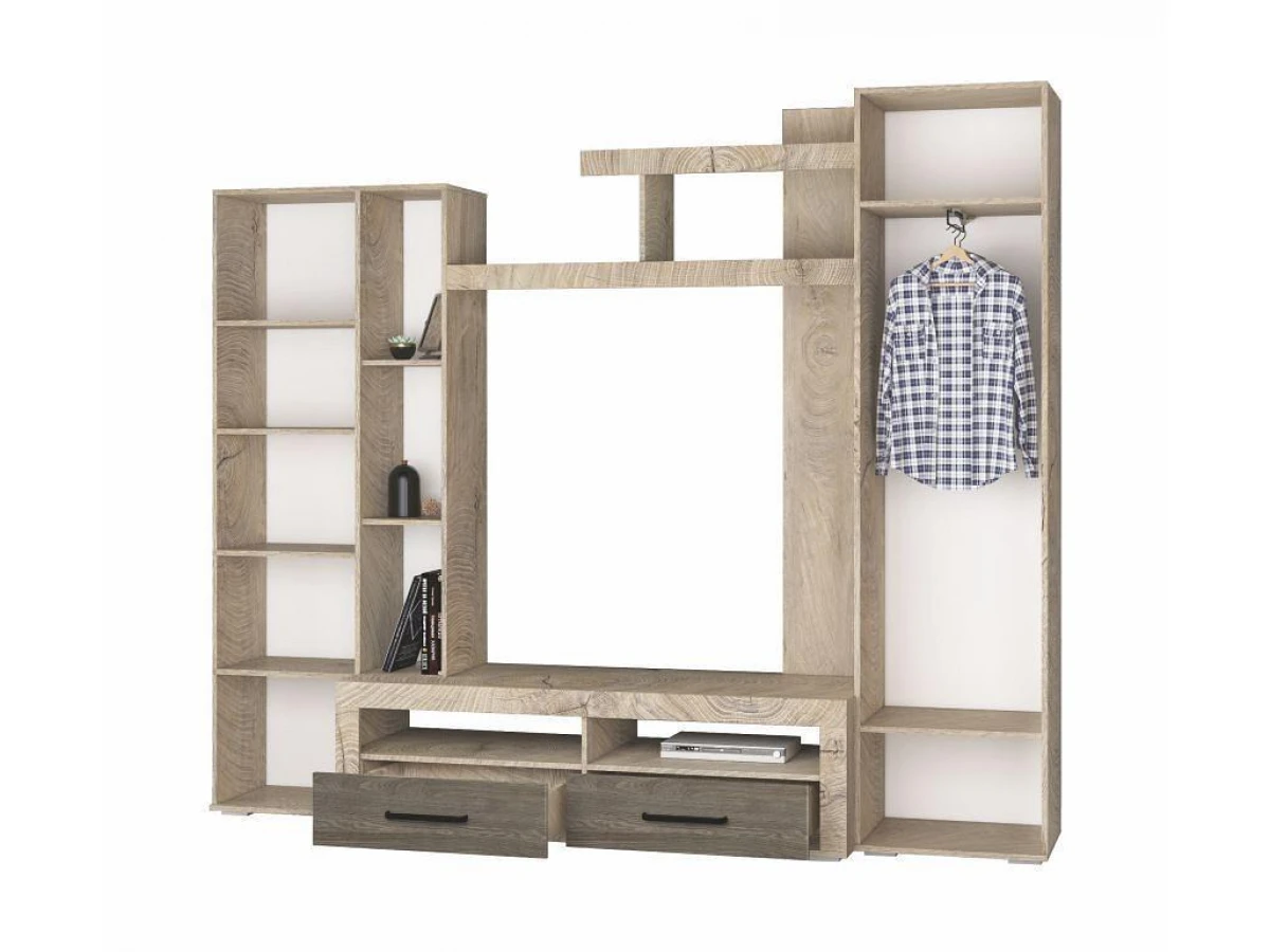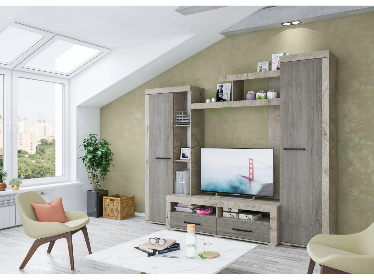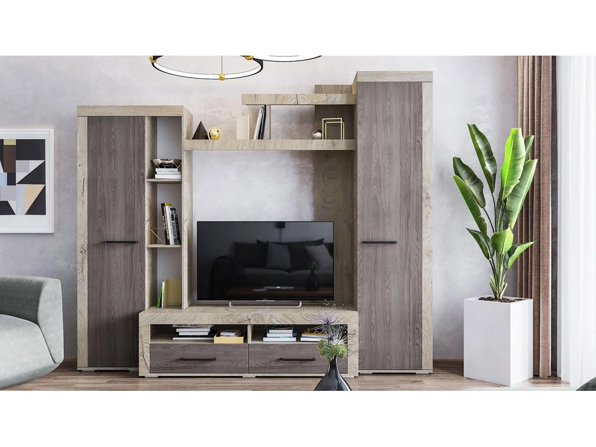 Ее вместительные модули и открытые полки предоставляют достаточно пространства для хранения и помогают соблюдать порядок, а ультрамодное сочетание цветов в оформлении придает гостиной особый стиль.
