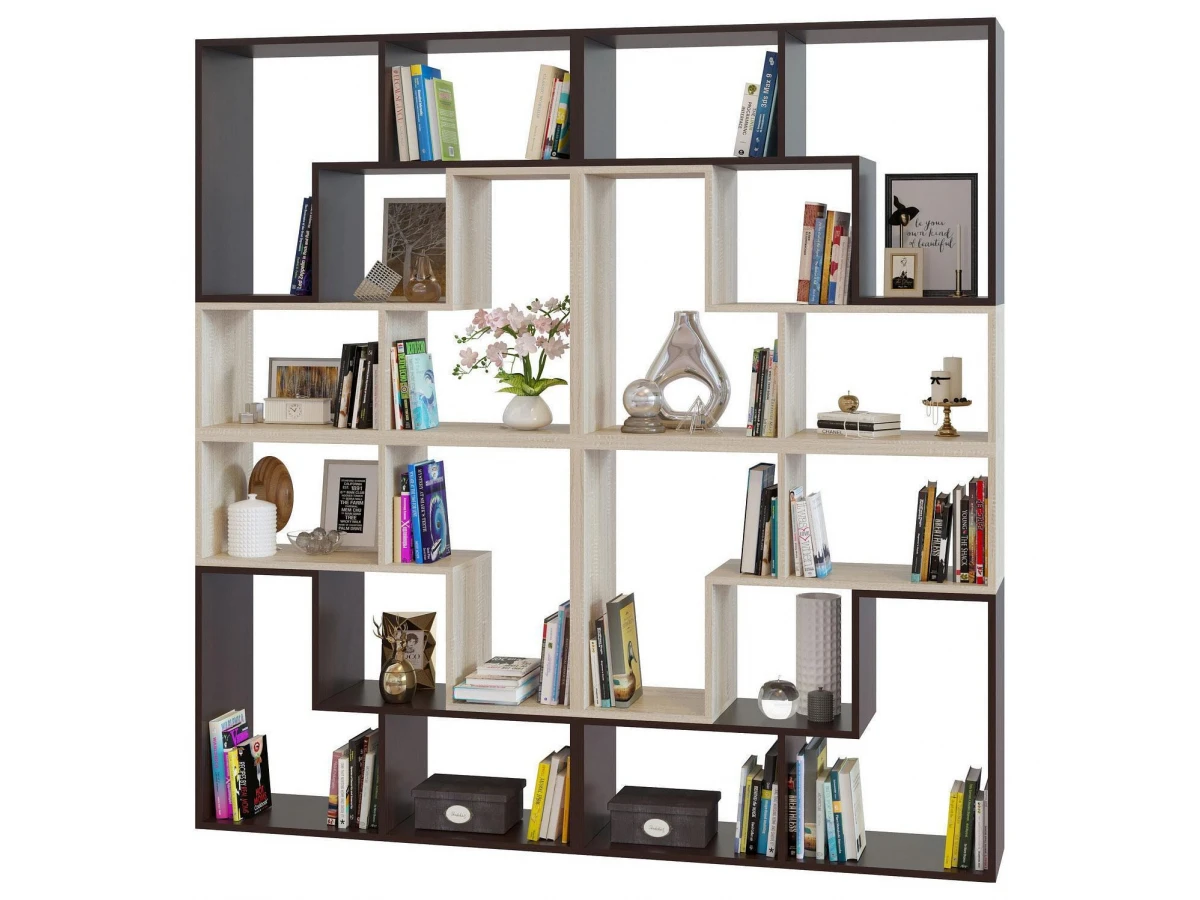 Широкий низкий стеллаж, выполненный в геометрии фигуры из знаменитой игры «Тетрис», позволит креативно разнообразить интерьер, вместе с тем создав удобные и практичные системы хранения для книг, предметов интерьера и самых разных мелочей.
