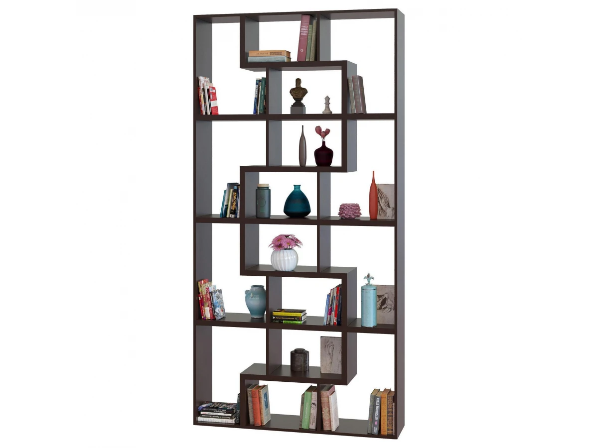 Широкий низкий стеллаж, выполненный в геометрии фигуры из знаменитой игры «Тетрис», позволит креативно разнообразить интерьер, вместе с тем создав удобные и практичные системы хранения для книг, предметов интерьера и самых разных мелочей.