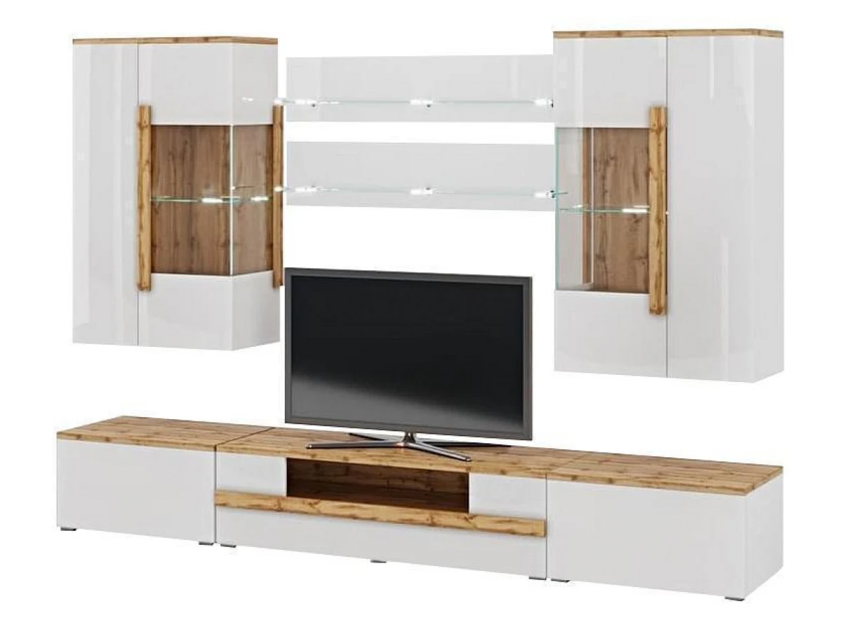 Приверженцы симметричности в интерьере высоко оценят композицию 15 Сахара, в состав которой дизайнеры включили компактные навесные витрины, тумбы с одним ящиком и тумбу под ТВ. Такой ансамбль не загромождает помещение, помогая сохранить в нем ощущение простора. Визуальную легкость модели гарантируют ЛДСП белый лак и стеклянные элементы. Подходящим вариантом для классики и конструктивизма ее делают вставки древесного оттенка дуб ватана. Среди преимуществ мебели следует отметить не только дизайн, но и высокое качество материалов и фурнитуры, гарантирующих композиции долговечность.