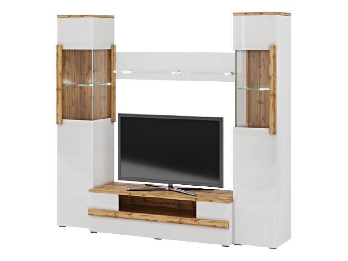Сделать интерьер небольших комнат комфортным и эргономичным поможет композиция 16 Сахара, элементы которой дизайнеры подбирали с особой тщательностью. В ансамбле присутствует только самые необходимые предметы: однодверные шкафы-витрины, оснащенные скрытыми и открытыми полками, тумба под ТВ и изящная навесная полка. Особенность гостиной – отсутствие внешней фурнитуры. Взамен традиционных механизмов производитель использовал изделия push to open, позволяющие сохранить визуальную гладкость поверхностей. Дополнительные преимущества мебели – устойчивость к внешним воздействиям и демократичная стоимость.