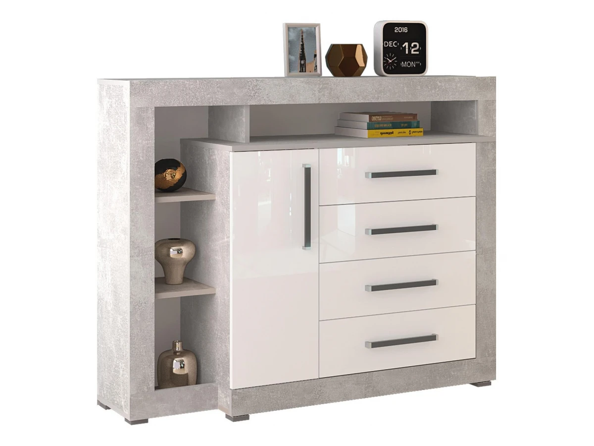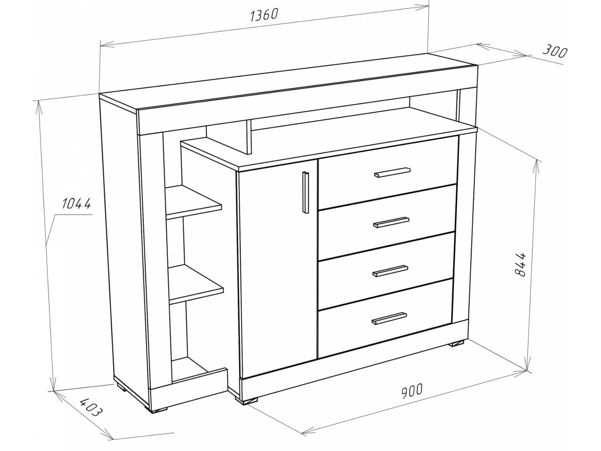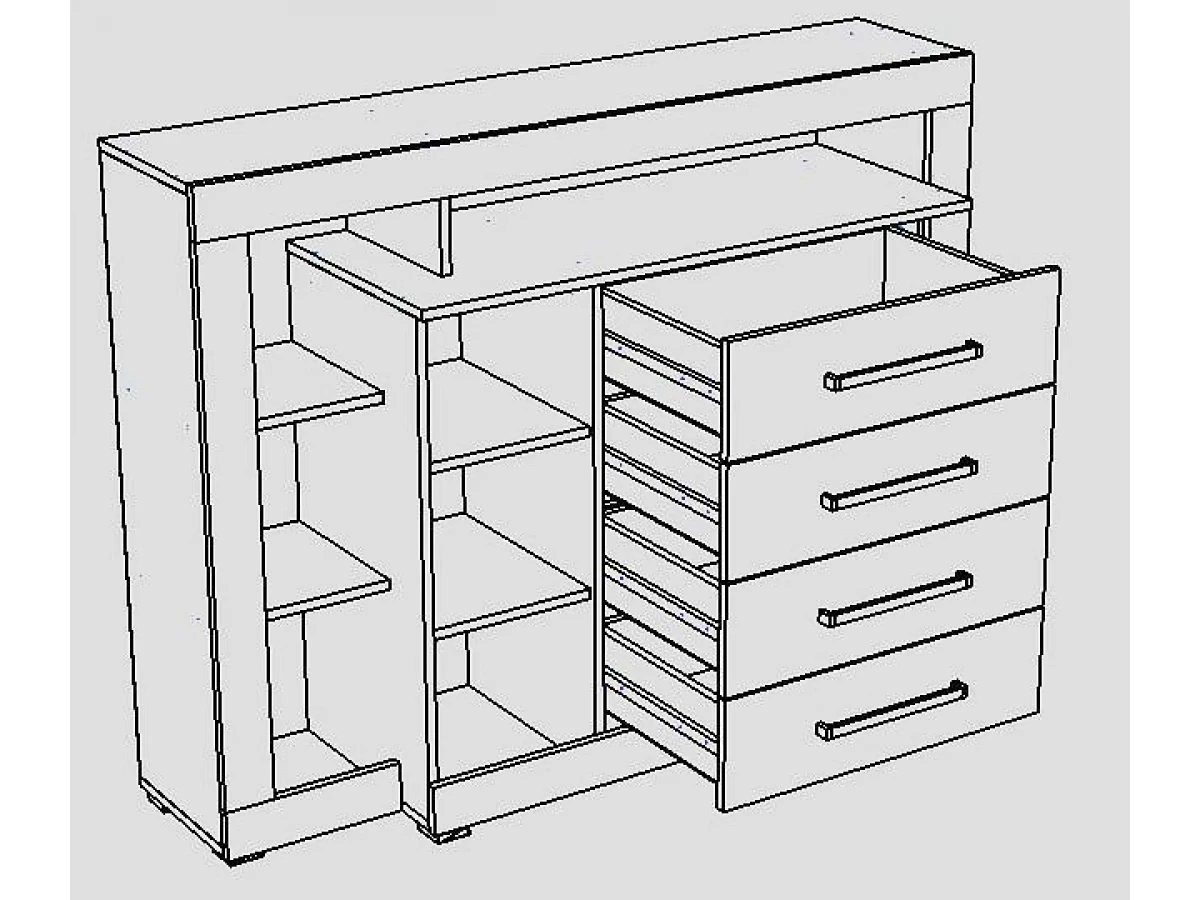 1 дверца, 4 ящика, полки