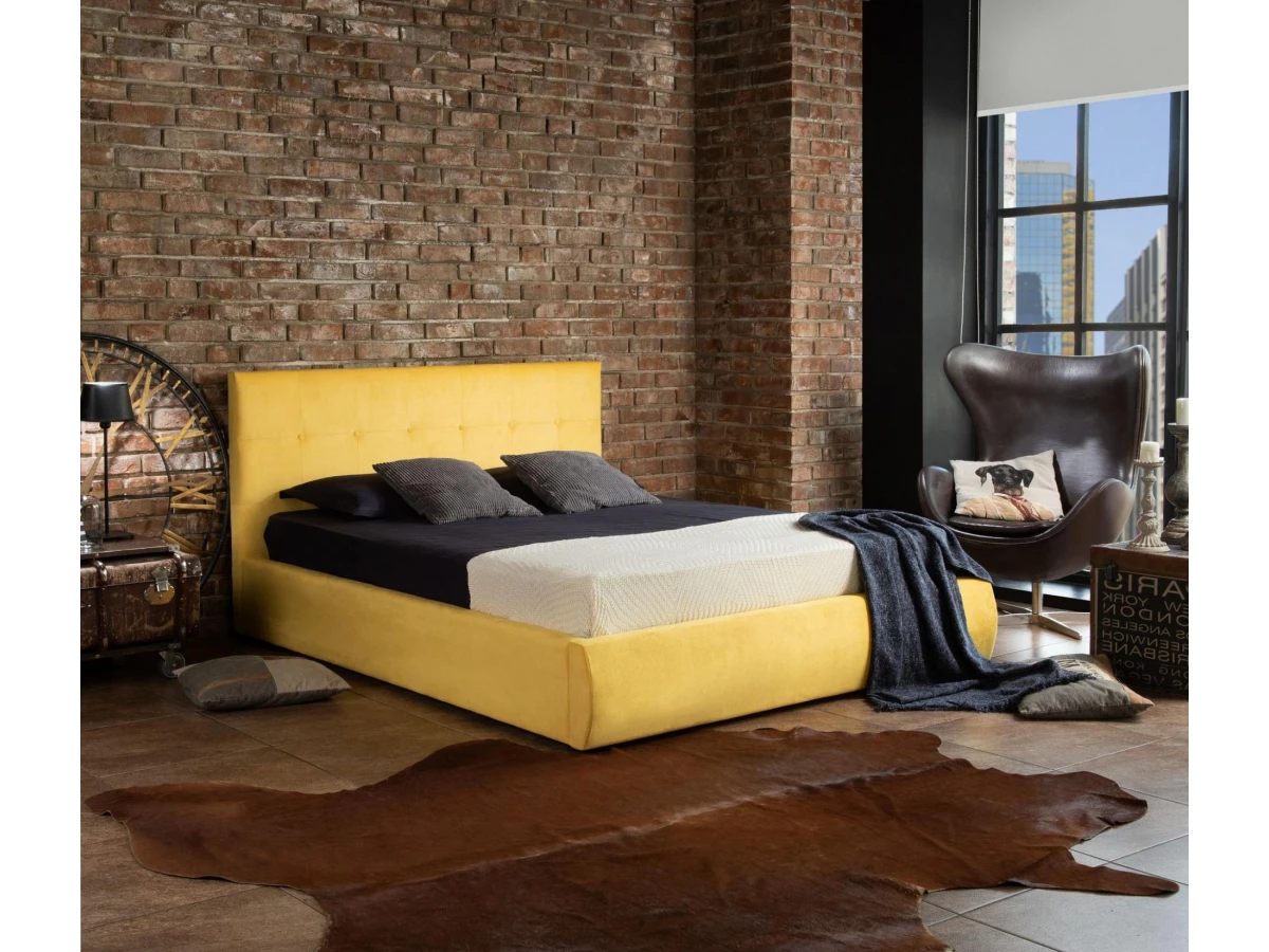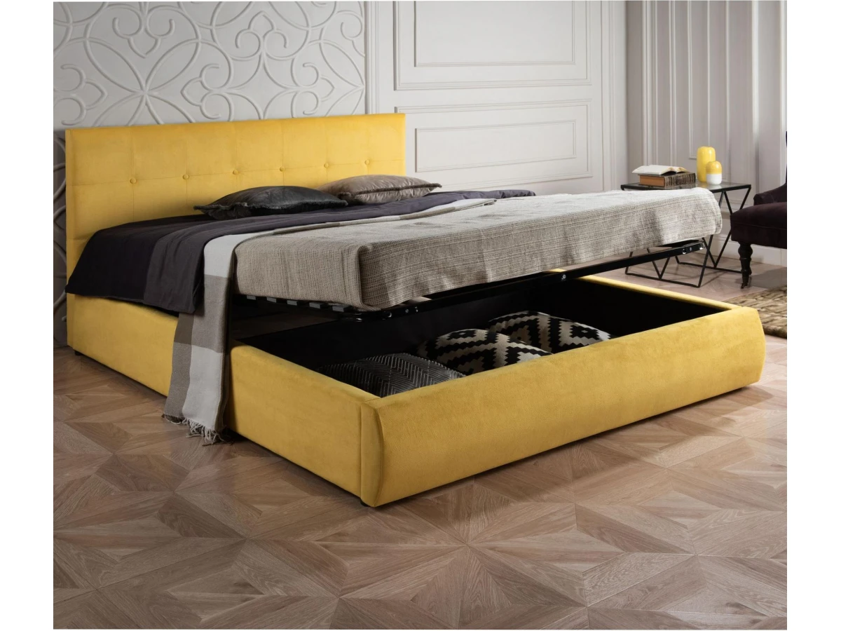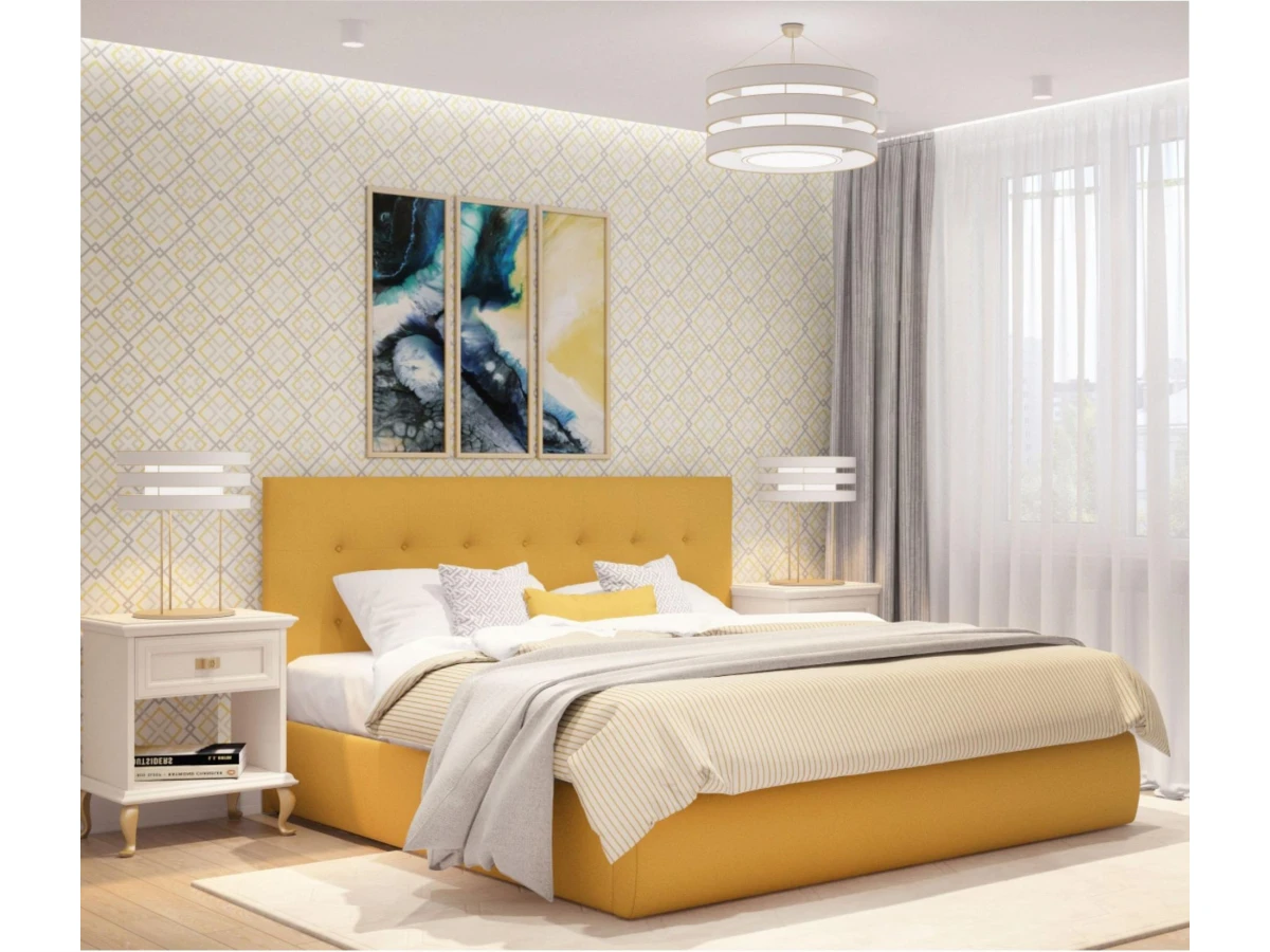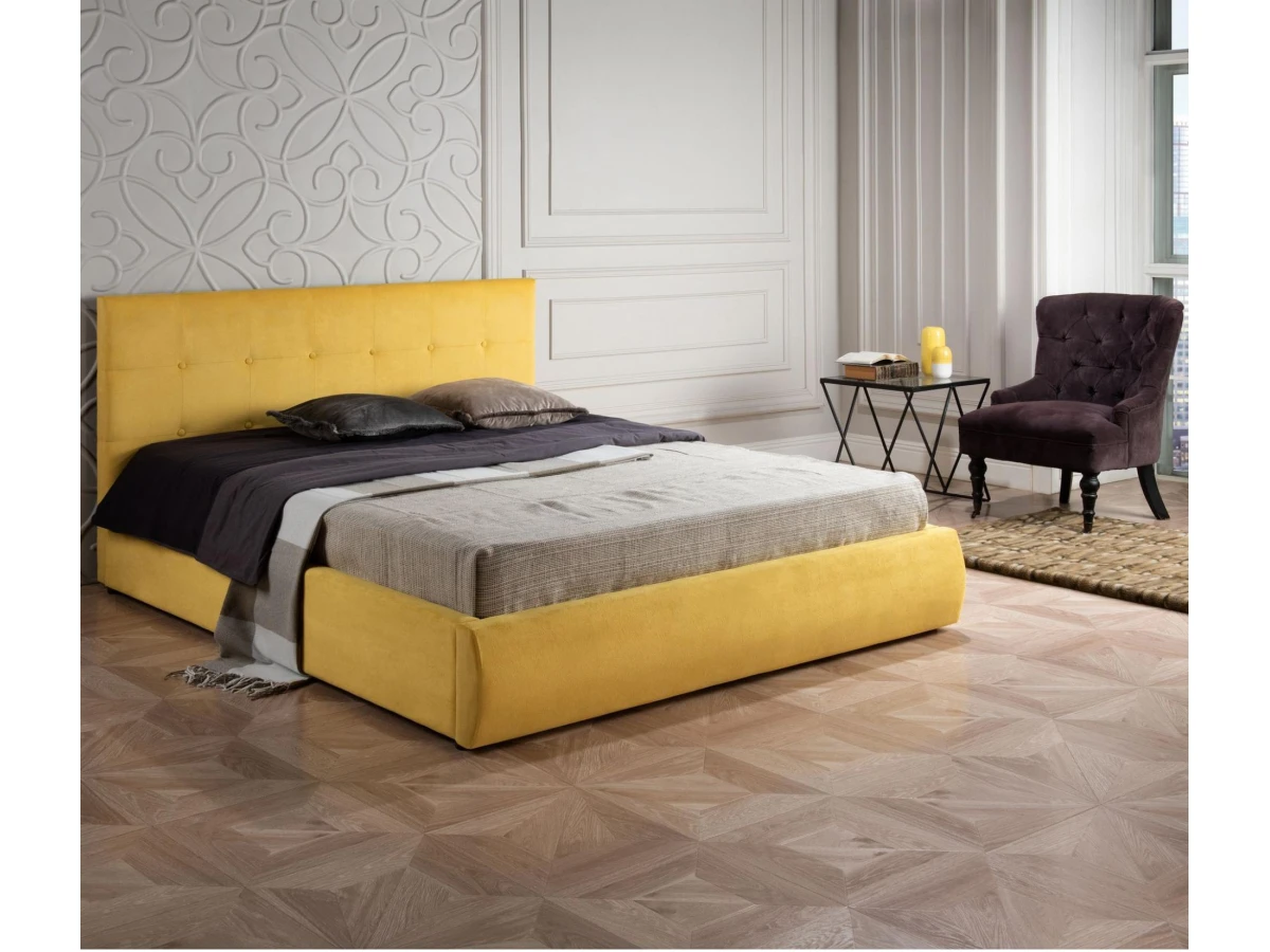 Кровать Селеста с высоким оригинальным изголовьем и подъемным механизмом имеет рельефную мягкую спинку с неглубокими стяжками, которые придают особую изысканность изголовью.