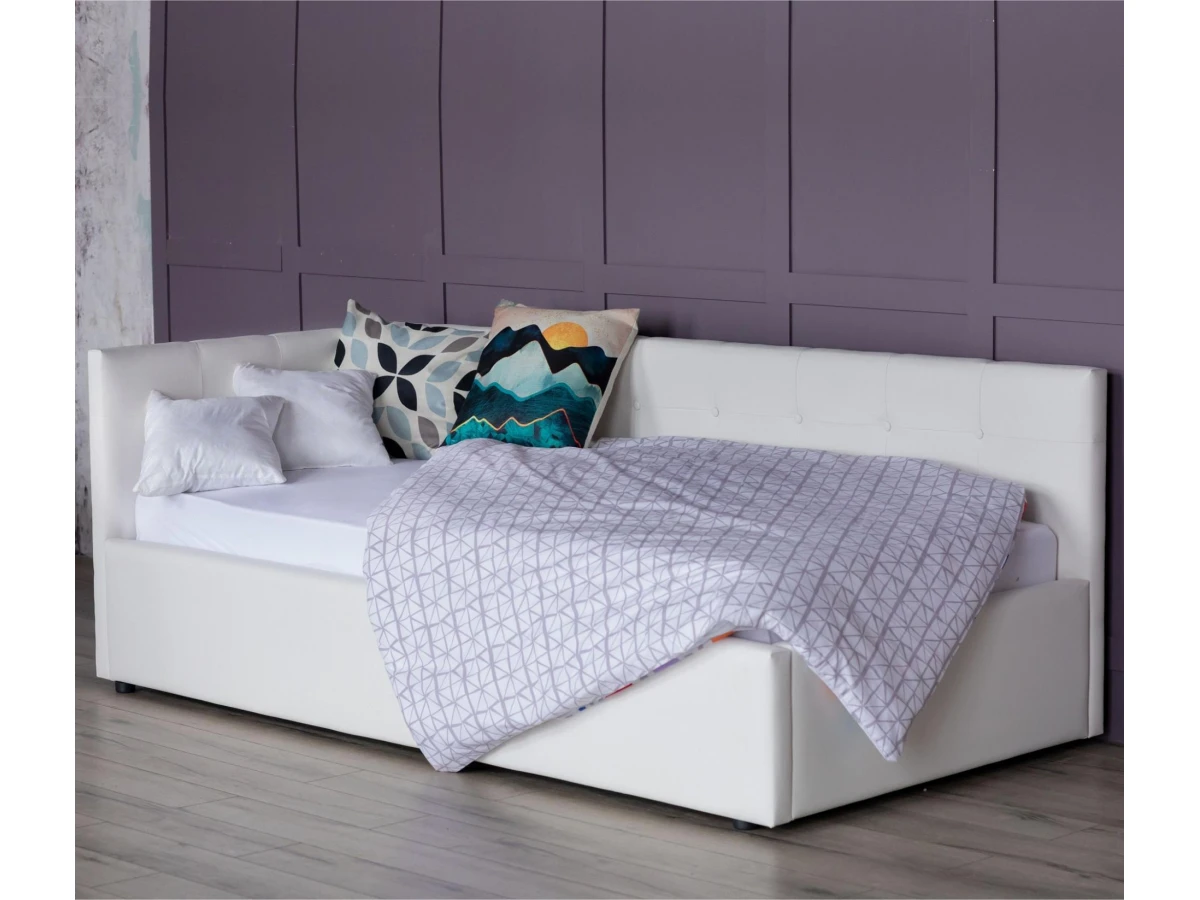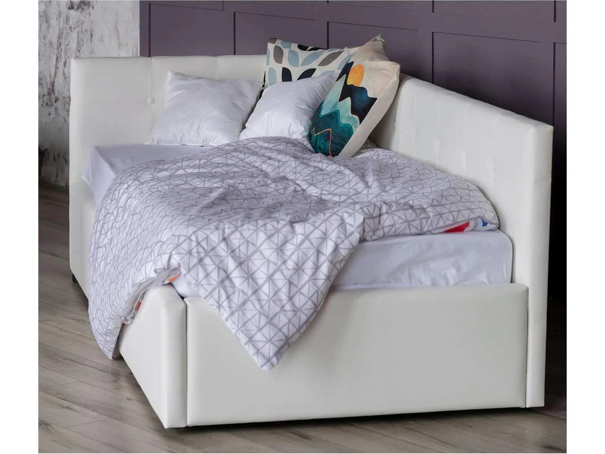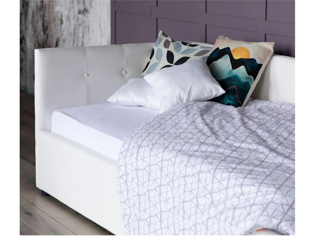 Рельефные спинки с неглубокими стяжками украшены декоративными пуговицами в тон обивки. Мягкие изголовья позволяют использовать кровать как мягкий диван для отдыха.
