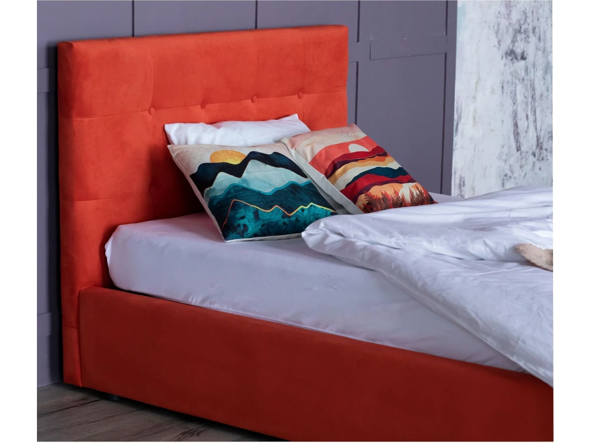 Спинка кровати мягкая, рельефная с неглубокими стяжками и декоративными пуговицами. Обивка изголовья и периметра кровати выполнена из велюра. Задняя стенка обшита спанбондом.