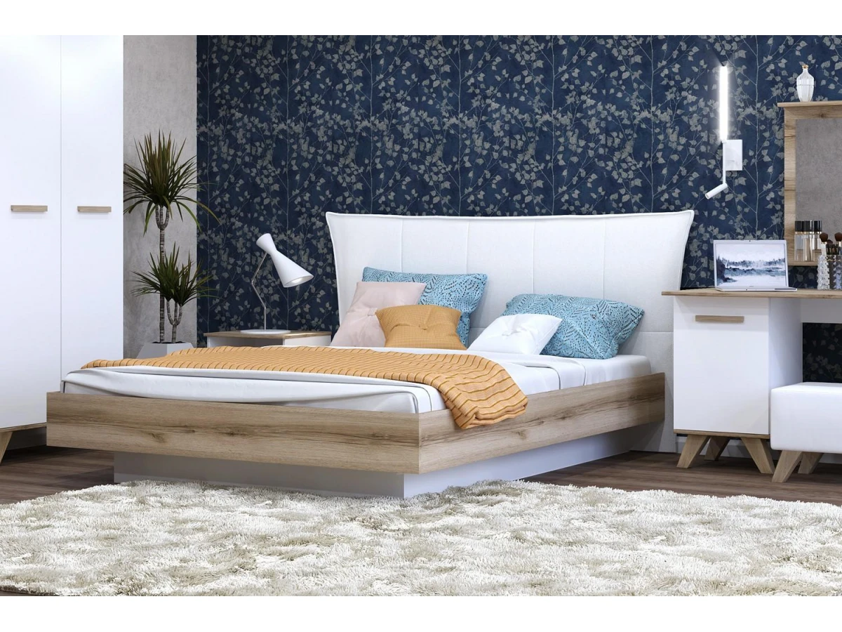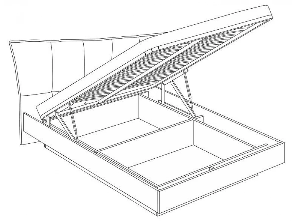 Мягкая спинка в изголовье кровати обеспечит комфортный отдых. Кровать оснащена подъёмным основанием и вместительным бельевым ящиком. Подъем основания обеспечивает надежный газлифт. Конструкция кровати устроена таким образом, что бельевой ящик углублен в пространство под кроватью, что создает эффект парения кровати.