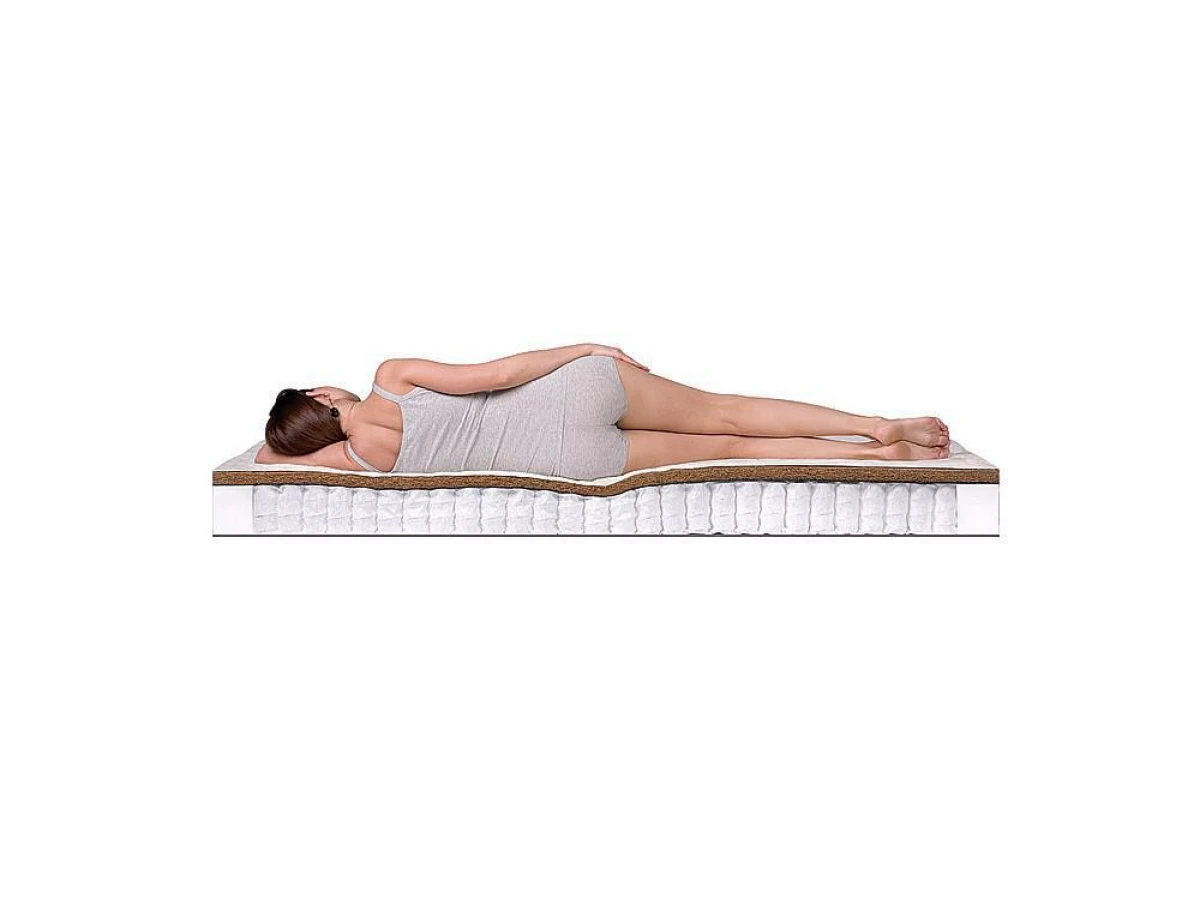 Смонтированные на независимом пружинном механизме TFK данный матрас прекрасно защищен от нежелательных колебаний. При этом его поверхности обладают различными свойствами. Сторона А – обладая высоким уровнем жёсткости, наполнитель из кокосовой койры обеспечивает комфортное расположение тела в горизонтальной плоскости и служит надёжной опорой для позвоночника. Сторона Б – благодаря наполнителю из натурального латекса обладает высокой анатомичностью, то есть свойством принимать форму тела, лежащего на матрасе, что способствует быстрому снятию мышечного напряжения и гарантирует глубокий здоровый сон. Прослойка из натурального льноджутового волокна защищает наполнители от преждевременного разрушения из-за трения о пружины.