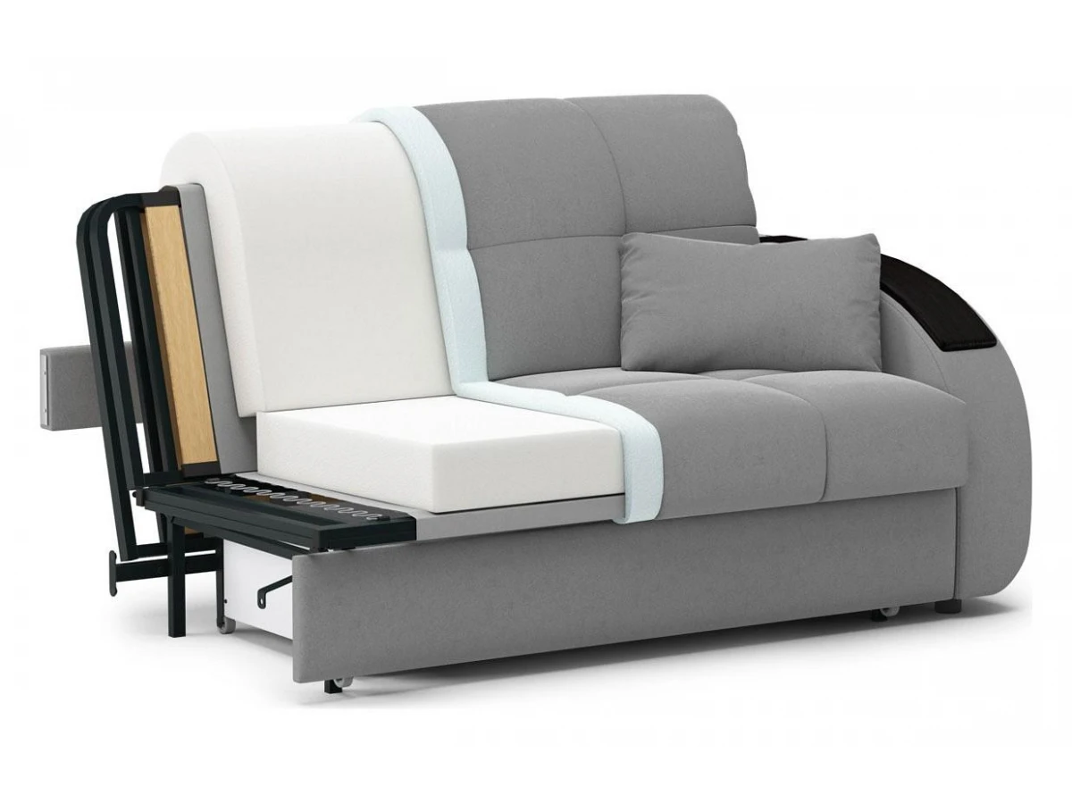 комфортный уровень посадкисовременный модный дизайннадежный механизм трансформации подходит для ежедневного использованиядиван обладает полноценным спальным местоморигинальный декор подлокотников выполняет функцию практичных столешницчехол модели съемный для чистки.
