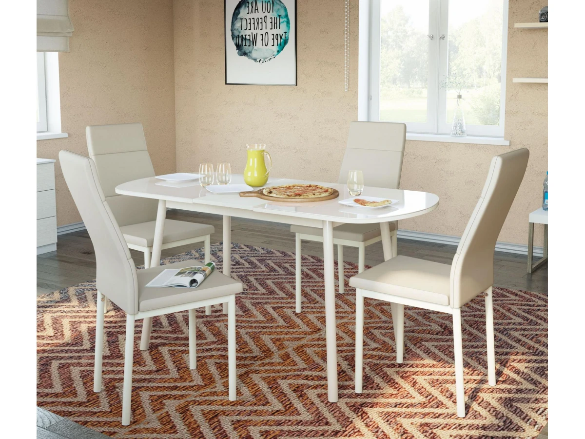 С помощью шариковых направляющих столешница раздвигается, дополнительная вставка из ЛДСП легко раскладывается одной рукой, увеличивая при этом длину стола до 152 см.
