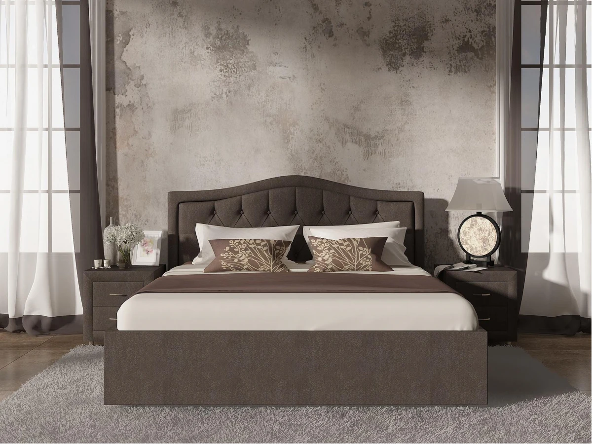 Элегантная интерьерная кровать с изголовьем, украшенным декоративными пуговицами. Обратная сторона изголовья обита спандбондом.