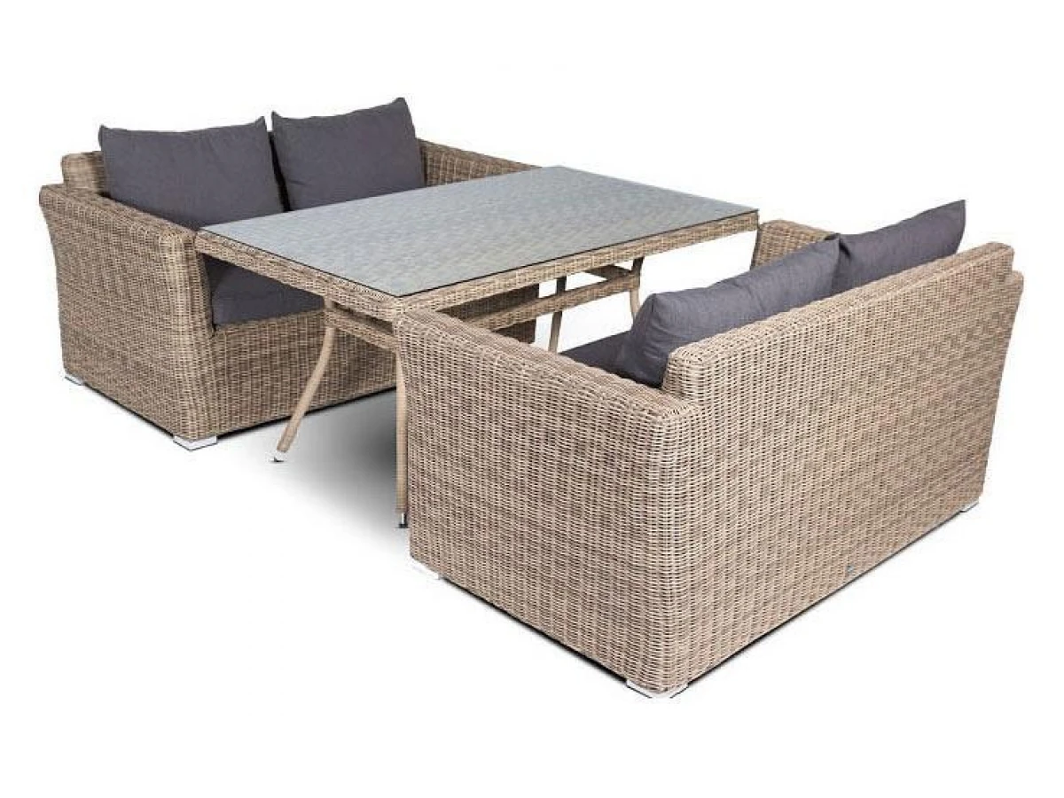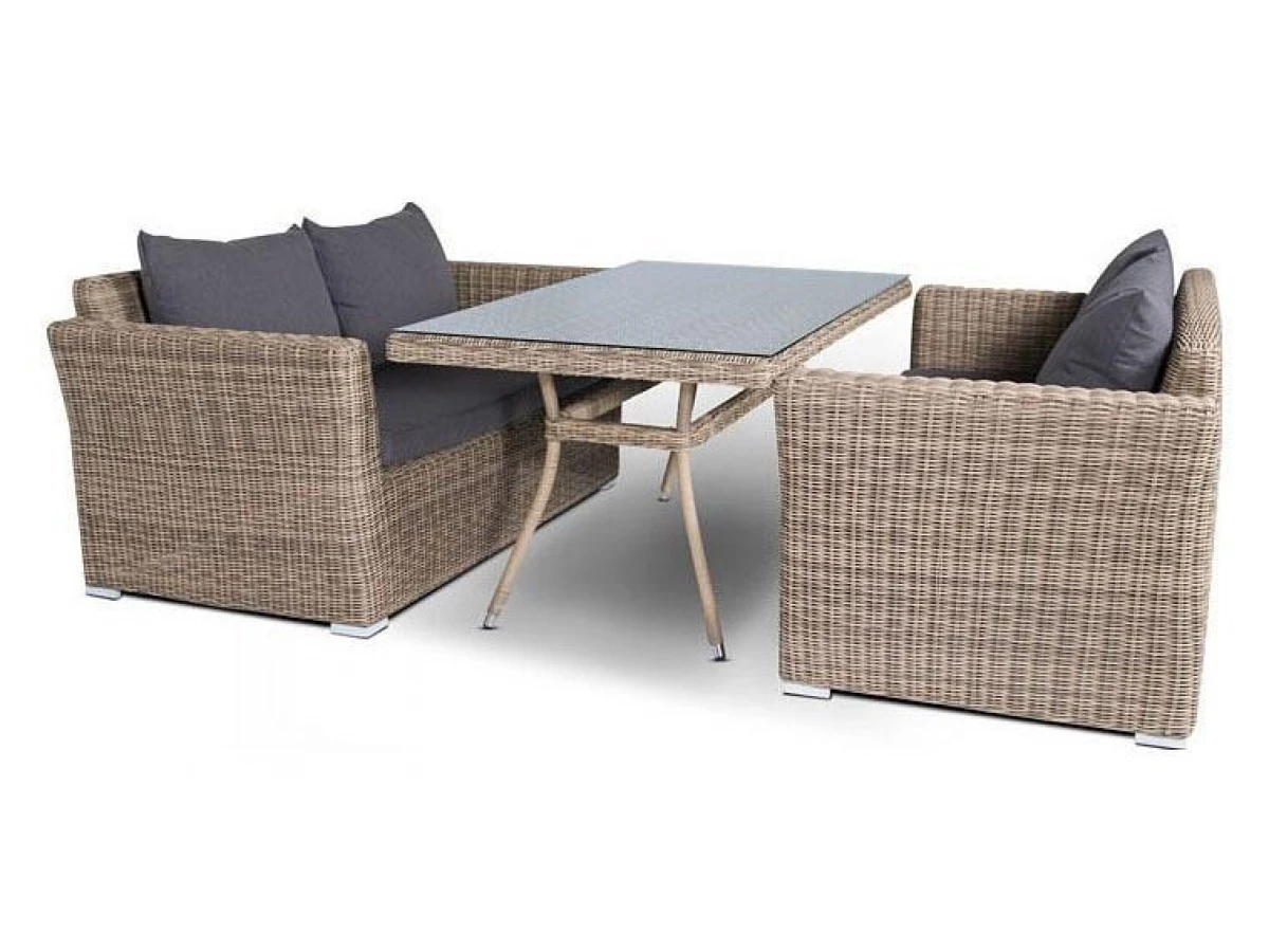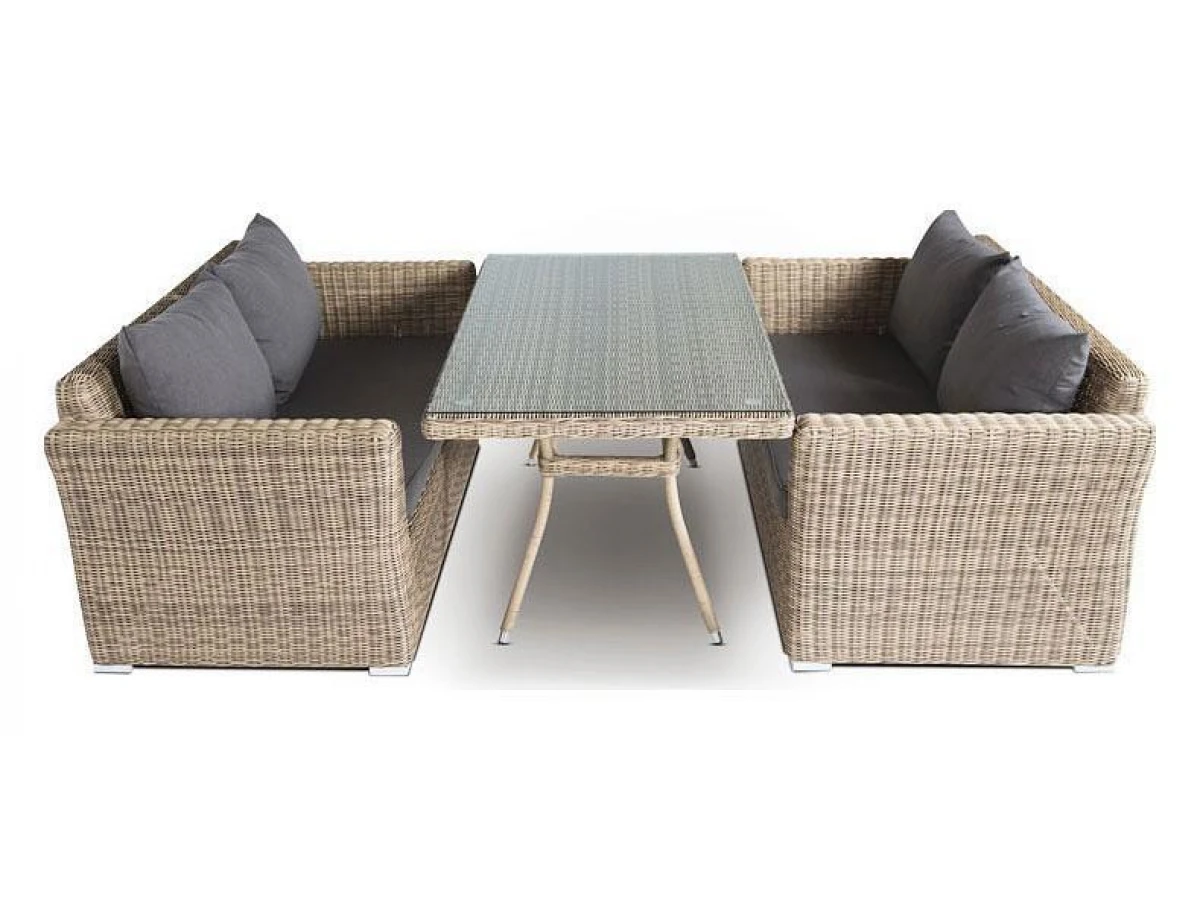 Подушки выполнены из водостойкой полиэфирной ткани для защиты мебели от дождя и солнца. Съемные чехлы.