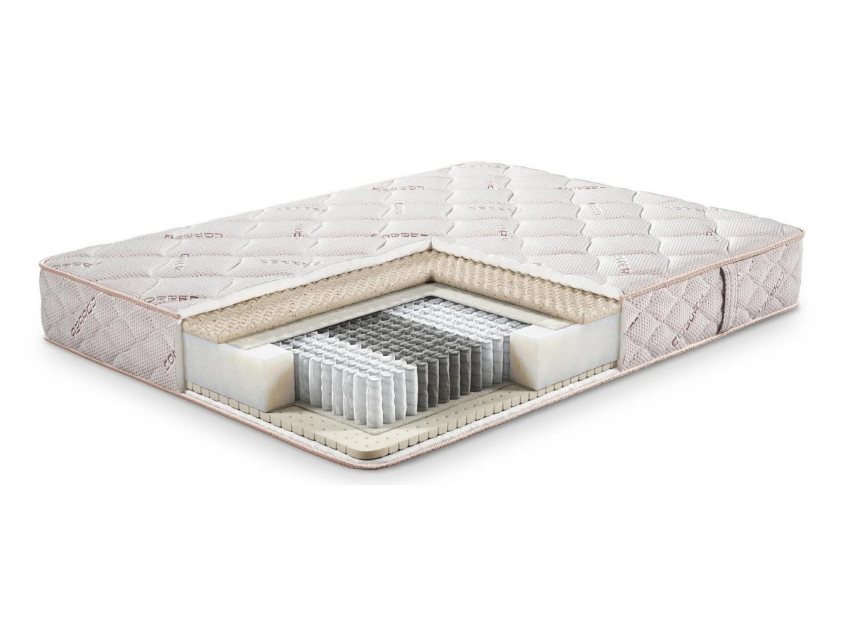 объёмный трикотажный чехол с медной пряжей Copper Double Comfort - нежная трикотажная ткань с медной пряжей CUPRUM в сочетании с двойным слоем сверхмягкого наполнителя, обладает эффектом терморегуляции, снимает мышечное напряжение, служит защитой от бактерий и аллергенов. Двойной комфорт для максимального расслабления;блок независимых пружин Point Pocket Spring 7-zone (1000 пружин на спальное место) - высокая адаптивность пружин, под каждый изгиб тела, «точечно» поддерживает позвоночник в анатомически правильном положении способствует расслаблению мышц и ускоряет засыпание;инновационная пена с ячеистой резкой c медным гелем CopperGEL® Massage - улучшает анатомические свойства матраса, добавляет микромассажный эффект, капсулы с медным гелем создают противомикробную защиту и легкий охлаждающий эффект;хлопковый войлок EcoFelt - защищает мягкие слои матраса, усиливает анатомический эффект пружинной системы;натуральный латекс - точно повторяет форму тела, выдерживает большое давление и быстро восстанавливает форму, улучшает воздухообмен;система усиления по периметру MOON EXTRA EDGE – защищает края матраса от провисания, удобно садиться и вставать;двусторонний матрас - увеличивает срок эксплуатации.