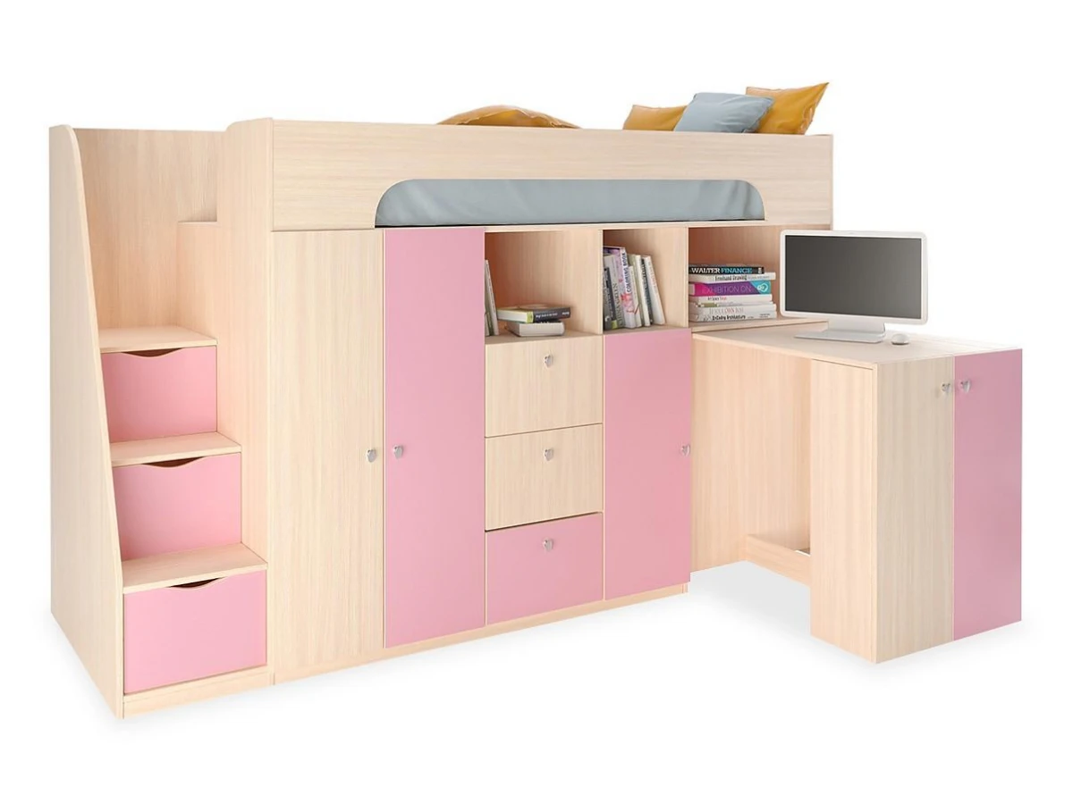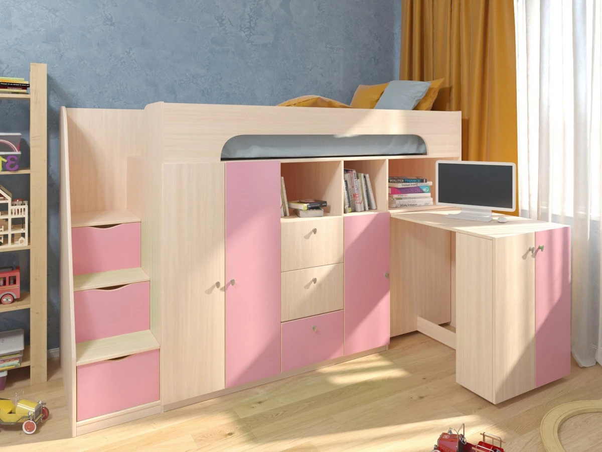 Ваш ребенок подрос и наступила пора обновить мебель в детской комнате? Набор для детской Астра 11 RVM_ASTRA11-1-8 – отличное решение, которое понравится не только вам, но и будущему маленькому хозяину или хозяйке. Изделие создано известным брендом РВ-Мебель (Россия) и входит в серию «Астра 11». Оригинальный матовый корпус оттенка дуб молочный, розовый смотрится изысканно и изящно, гармонично дополняя фасад, изготовленный из надежного и оптимального для детской материала (ЛДСП Е1). Перед приобретением новой кровати не забудьте тщательно замерить свободную площадь в помещении, чтобы кровать оптимально подошла по размерам (1430 мм в высоту, 2360 мм в ширину и (уточните актуальную информацию у нашего консультанта) мм в длину), а также подобрать матрас 1900x800 мм. В комплект входит лестница-комод: 3 ящика;
