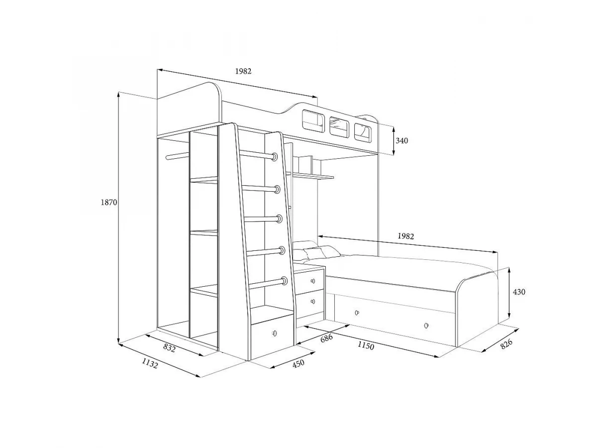 Верхний ярус расположен стандартным образом и попасть туда можно при помощи боковой лесенки. Верхняя кровать имеет надежное ограждение для безопасности спящего, а лесенка дополнительный выдвижной ящик. Нижний же отдел детской кровати имеет нестандартное решение. Обычно обе кровати располагаются одна над другой, но здесь вариант получился не менее выигрышным. Кровать снизу расположена перпендикулярно верхней, за счет чего освобождается место у стены.