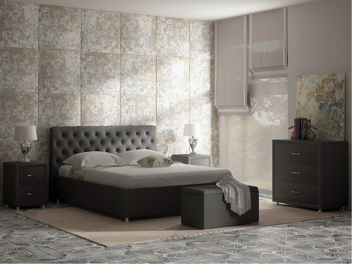 Элегантная интерьерная кровать с изголовьем, украшенным декоративными пуговицами и глубокой пиковкой. В комплект кровати входит кроватное основание. Каркас основания выполнен из металла, ламели - из берёзы.