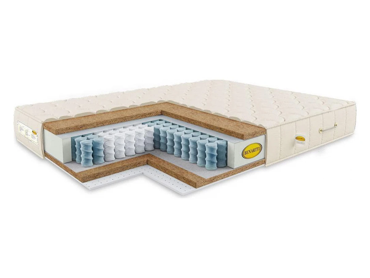 С одной стороны матраса расположен слой кокосовой койры высотой, которая придает дополнительную жесткость и долговечность матрасу.