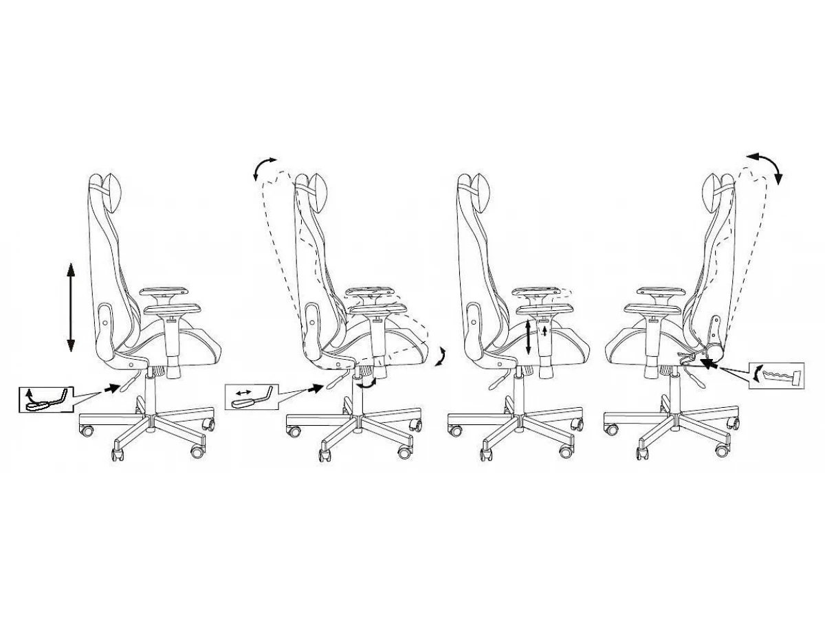 Механизм качания с регулировкой под вес и возможностью фиксации в вертикальном положении. Регулировка высоты (газлифт). Регулировка угла наклона спинки (реклайнер 90-150 градусов). Поддержка шеи и поясницы (2 подушки). Подлокотники пластиковые 3D. Крестовина металлическая. Колеса для паркета и ламината.
