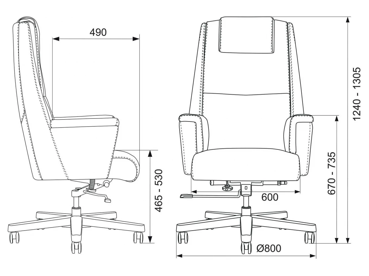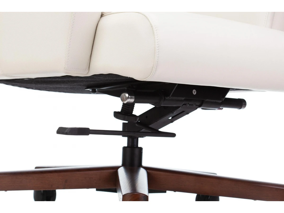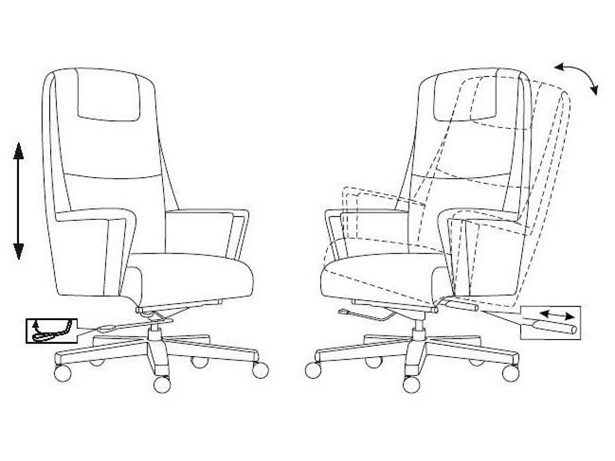 Механизм со смещенной осью качания с возможностью фиксации в вертикальном положении. Регулировка высоты - газлифт. Подлокотники монолитные кожаные. Спинка цельная с сиденьем.