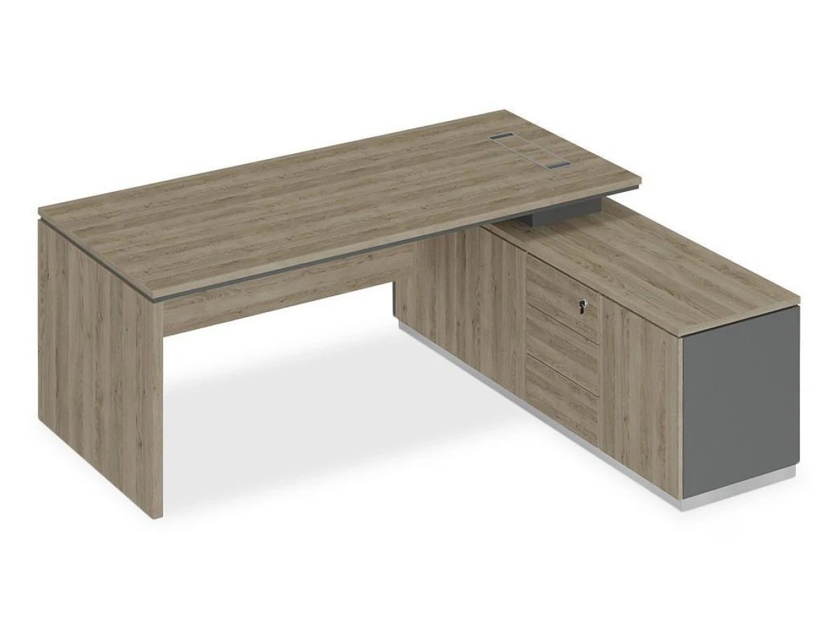 Стол состоит из столешницы, заглушки кабель-канала, опоры ДСП, экрана и опорной тумбы.