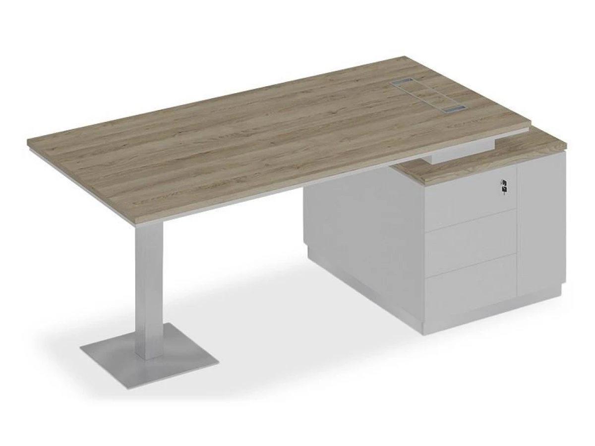Стол состоит из столешницы, заглушки кабель-канала, металлической опоры и опорной тумбы.