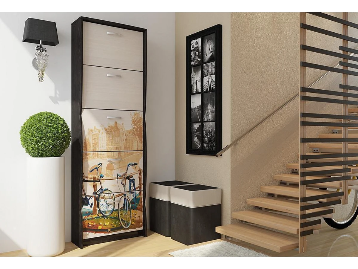 Модель оптимальна для обустройства прихожей в доме, где проживает большая дружная семья. Благодаря увеличенной высоте эта тумба вместит в себя летнюю и зимнюю, уличную и домашнюю обувь, туфли и сапоги, сандалии и кроссовки, тапочки и ботинки. В вашей прихожей всегда будет идеальный порядок, а стильный дизайн мебели за счёт оригинального контрастного сочетания светлого и темного материала, а также декоративного фасадного рисунка станет эффектным украшением интерьера.