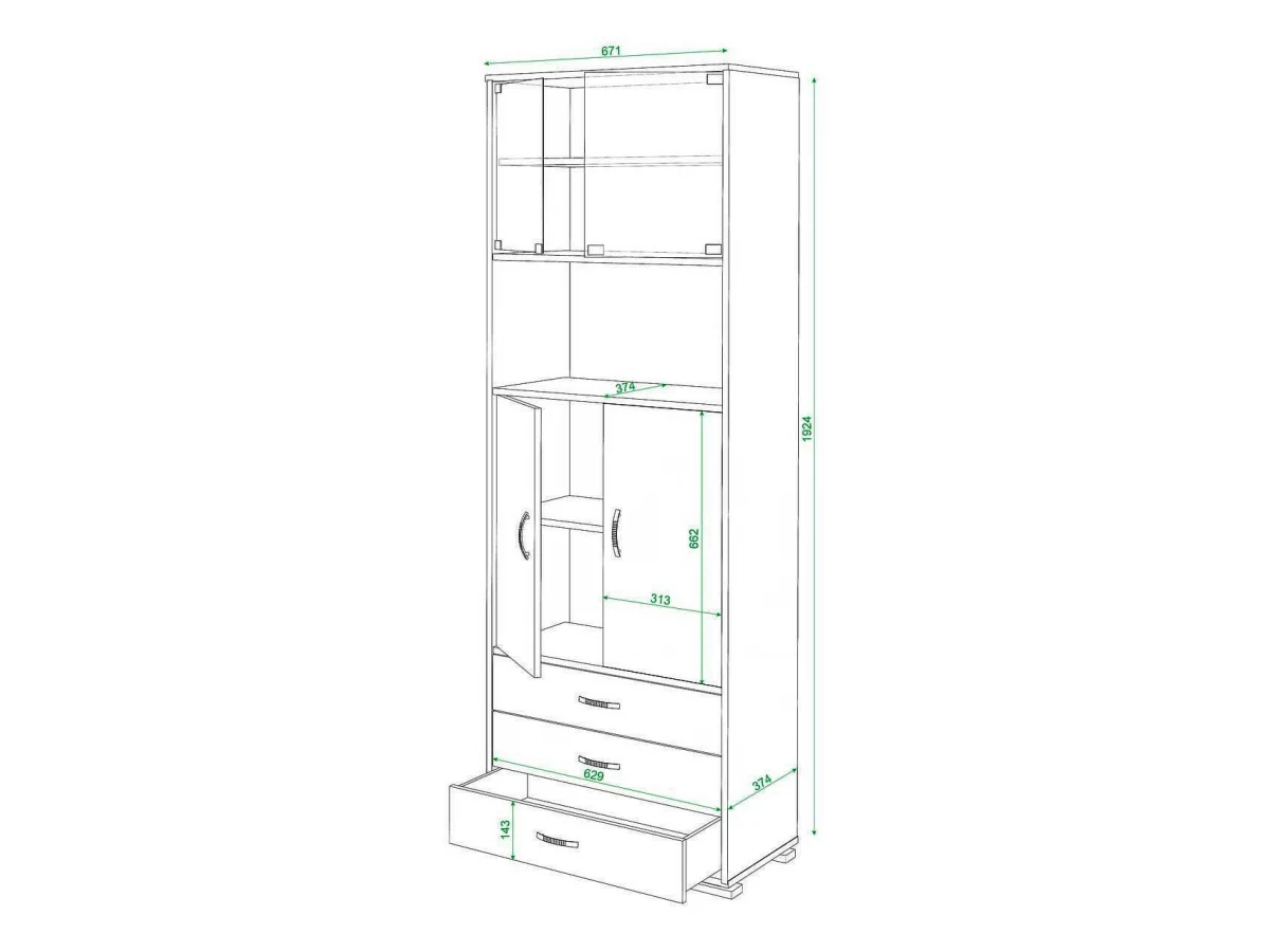 Вместительный шкаф. За двумя центральными дверцами находится полка, глубина полки - 356 мм. Открытая полка регулируется по высоте. Стекла в комплект не входят и продаются отдельно.