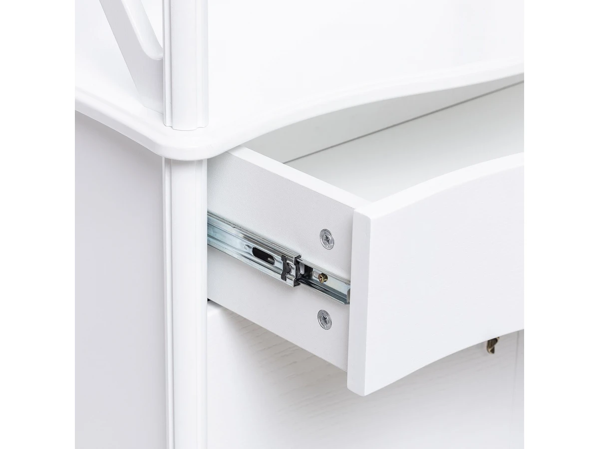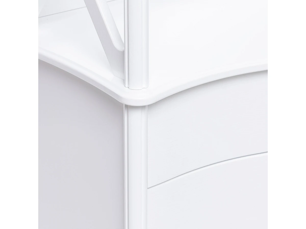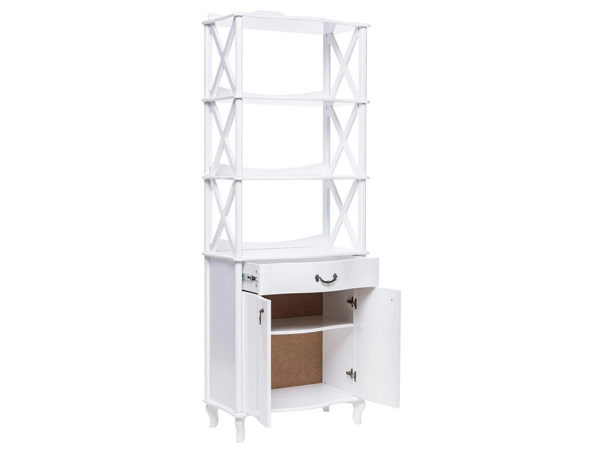 Ярусная конструкция включает 3 полки, выдвижной ящик и тумбу. Вместительные полки, выдерживающие нагрузку до 15 кг, предназначены для хранения посуды, элементов декора и личных вещей.