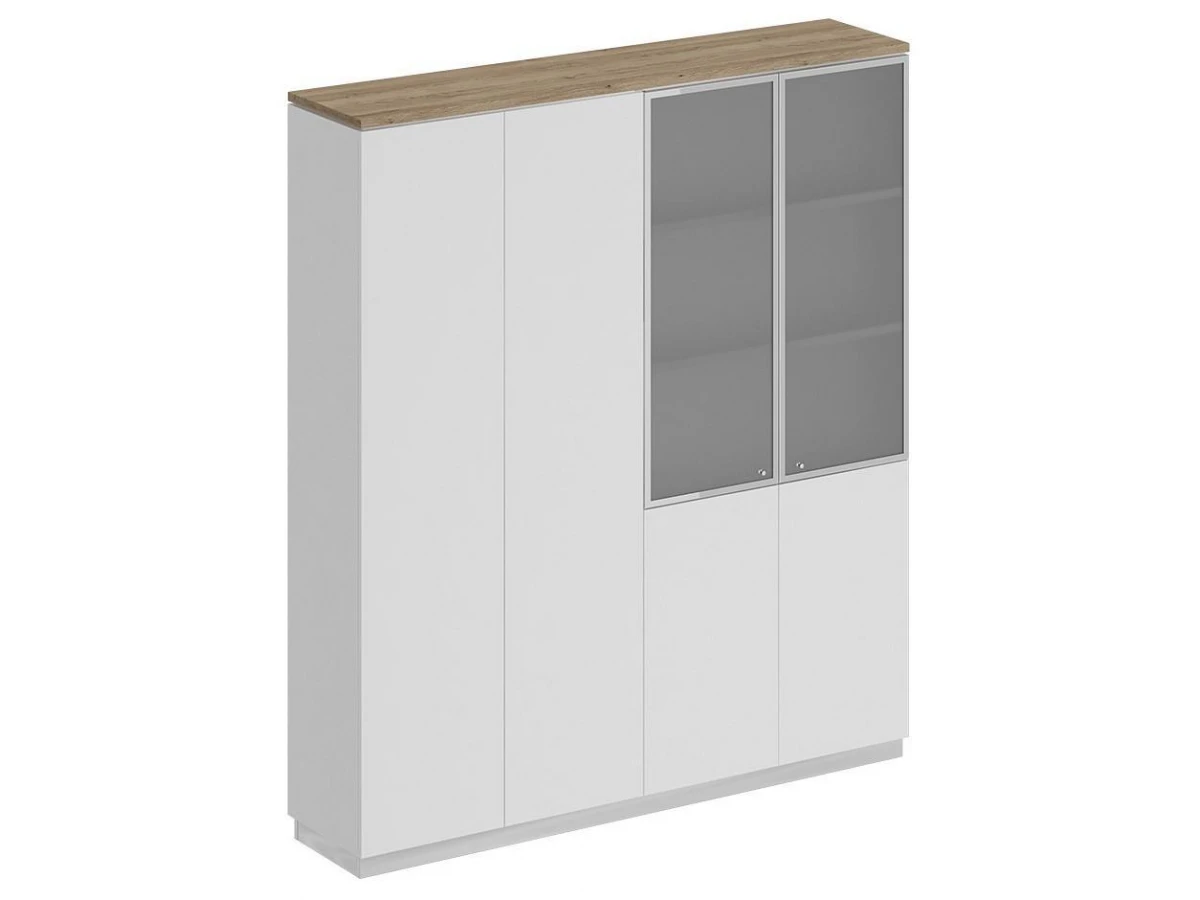Шкаф состоит из шкафа для документов со стеклом и закрытого шкафа для документов под общим топом, цоколя и дверей.