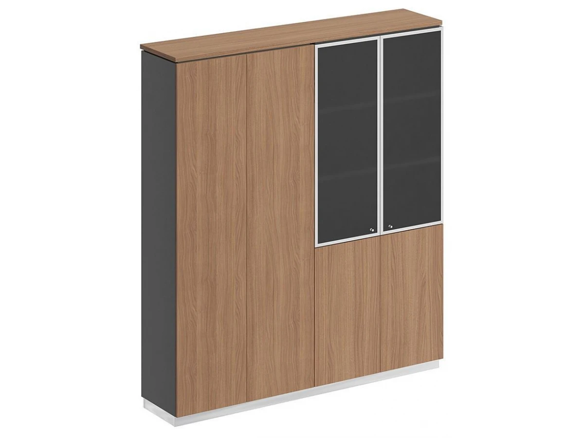Шкаф состоит из шкафа для документов со стеклом и закрытого шкафа для документов под общим топом, цоколя и дверей.