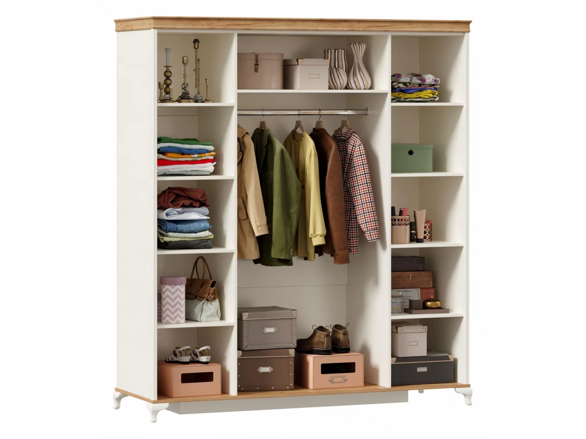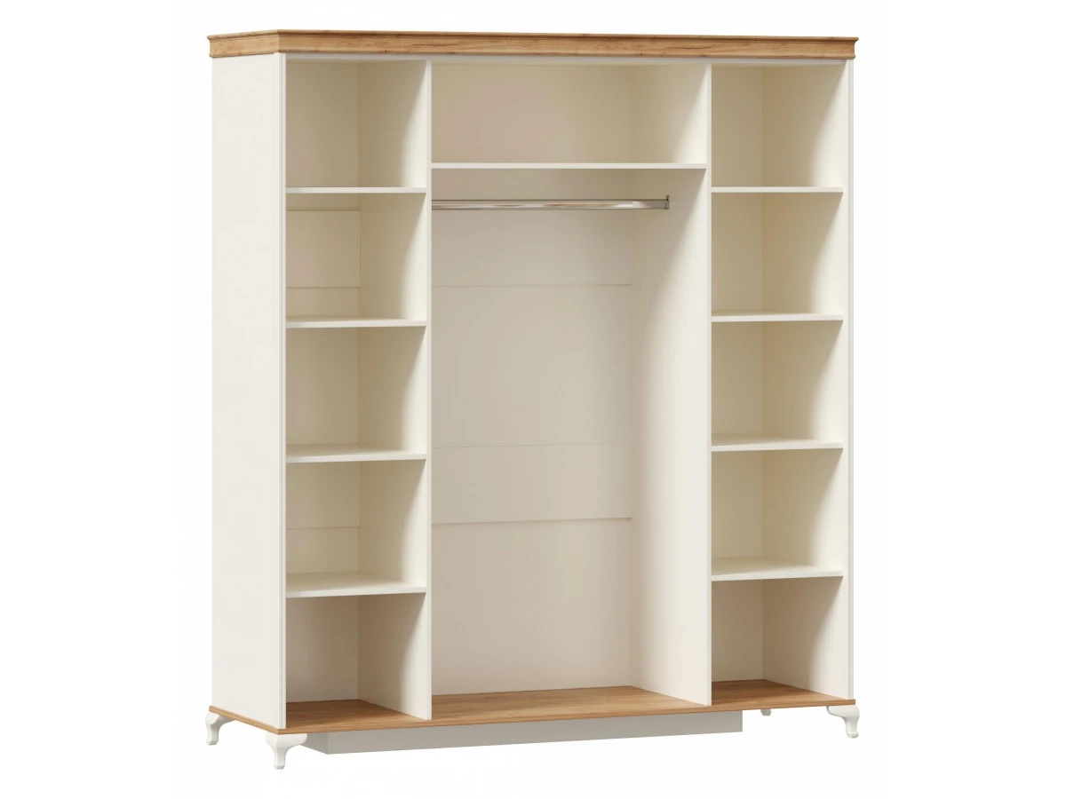 За 4-мя распашными зеркальными дверями 3 отделения – справа и слева одностворчатые отделения ширина 436 мм, в центре двухстворчатое отделение шириной 872 мм.Справа и слева по 4 полки. Расстояние между полками 360 мм.В центре 1 полка и штанга. Ниша вверху высотой 296 мм. Высота ниши со штангой 1582 мм.Максимальная нагрузка на полку - 15 кг.Ручки в комплекте к корпусу.Корпус шкафа комплектуется пилястрами и карнизом.Шкаф установлен на опоры ППУ и потайной короб-опору.Шкаф рекомендуется крепить к стене с помощью угловой подвески. Подвеска в комплекте.Крепеж для подвески к стене приобретается дополнительно.Размеры шкафа даны с учетом опор, пилястр и карниза.