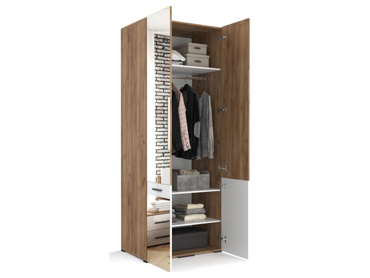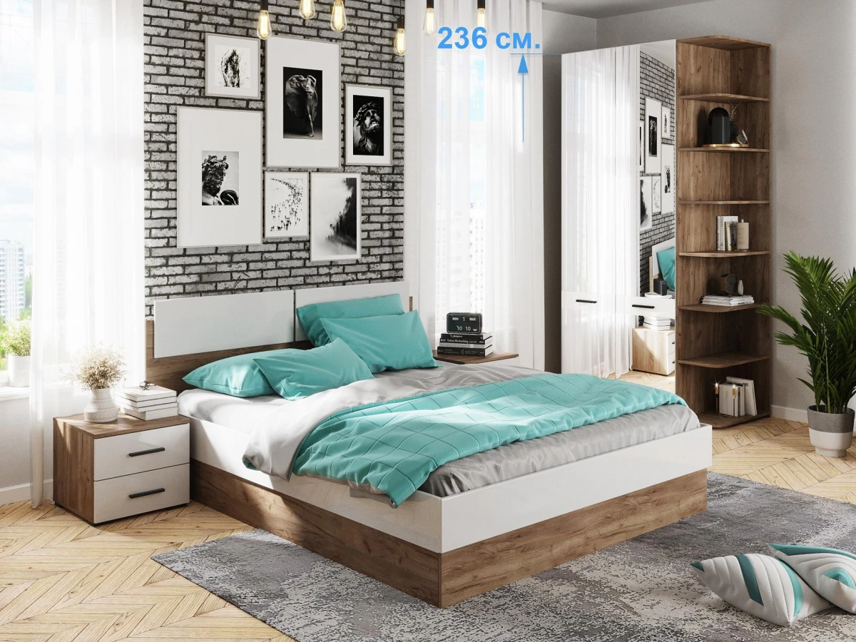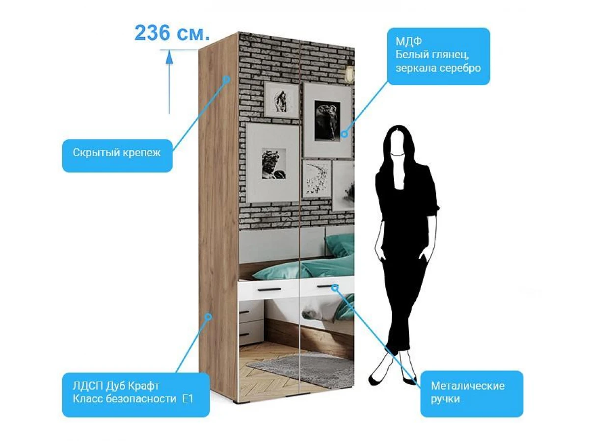 - Скандинавские декоры - лдсп Дуб Крафт и МДФ Белый глянец, зеркала серебро, мебельные ручки черного цвета.