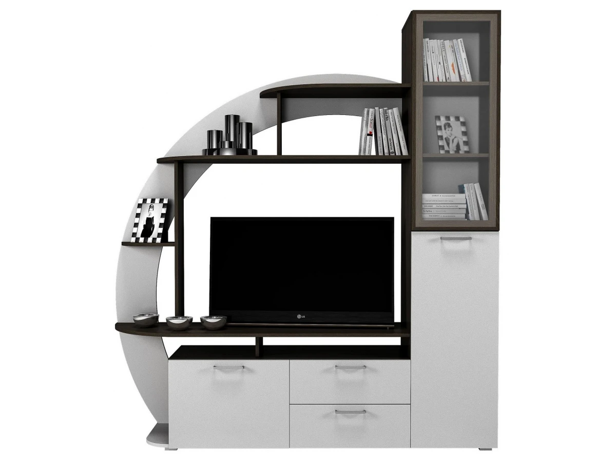 Тумба под ТВ с двумя выдвижными ящиками на шариковых направляющих, с тремя распашными дверцами и открытыми полками.