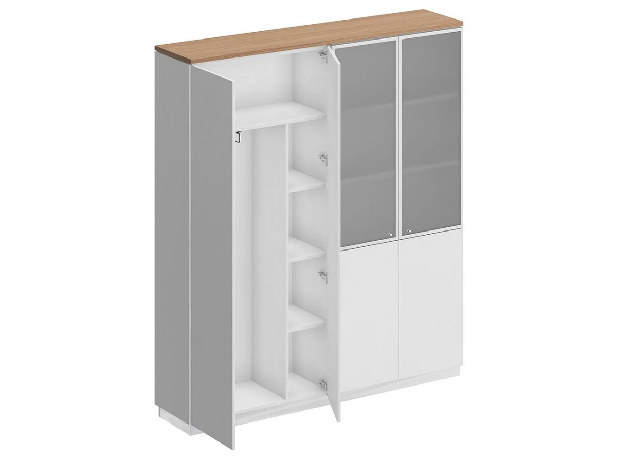 Шкаф состоит из шкафа для документов со стеклом и шкафа для одежды с дополнением под общим топом, цоколя на 2 шкафа и дверей.